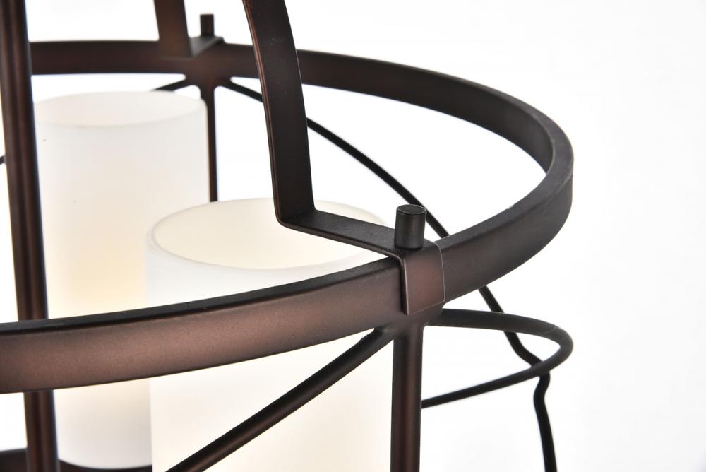 A playful composition with vintage appeal, Wren collection hanging fixtures are a unique blend of form and function. An oval Iron frame in a dark-copper brown finish connects to a stout chain and circular mounting fixture while Iron strips arch above and Iron Rods swirl around the sides. Nestled in the center, like eggs in a basket, three cylindrical frosted white Glass shades sit snugly atop curved arms. The perfect accompaniment for rustic or nautical décor in a living room, office, or bedroom.