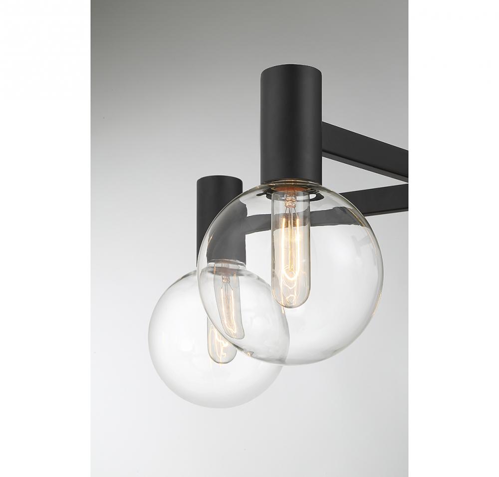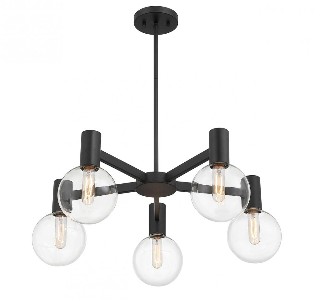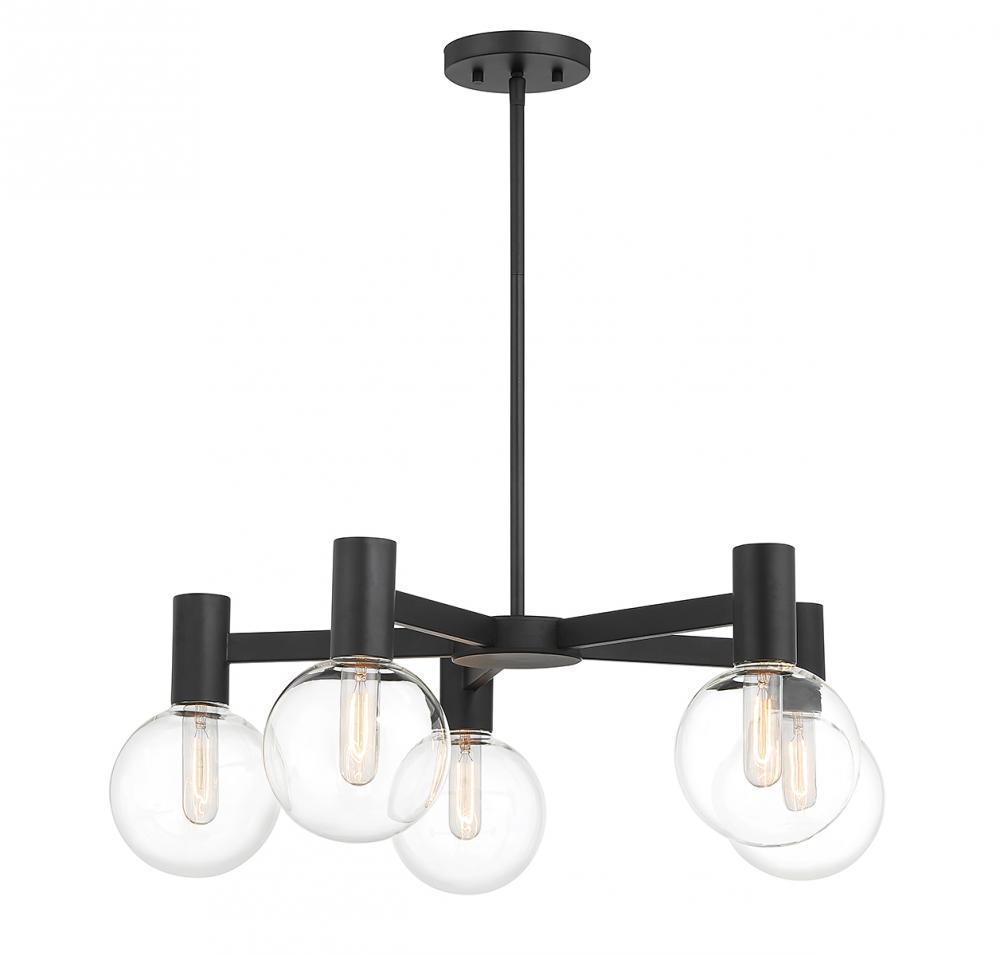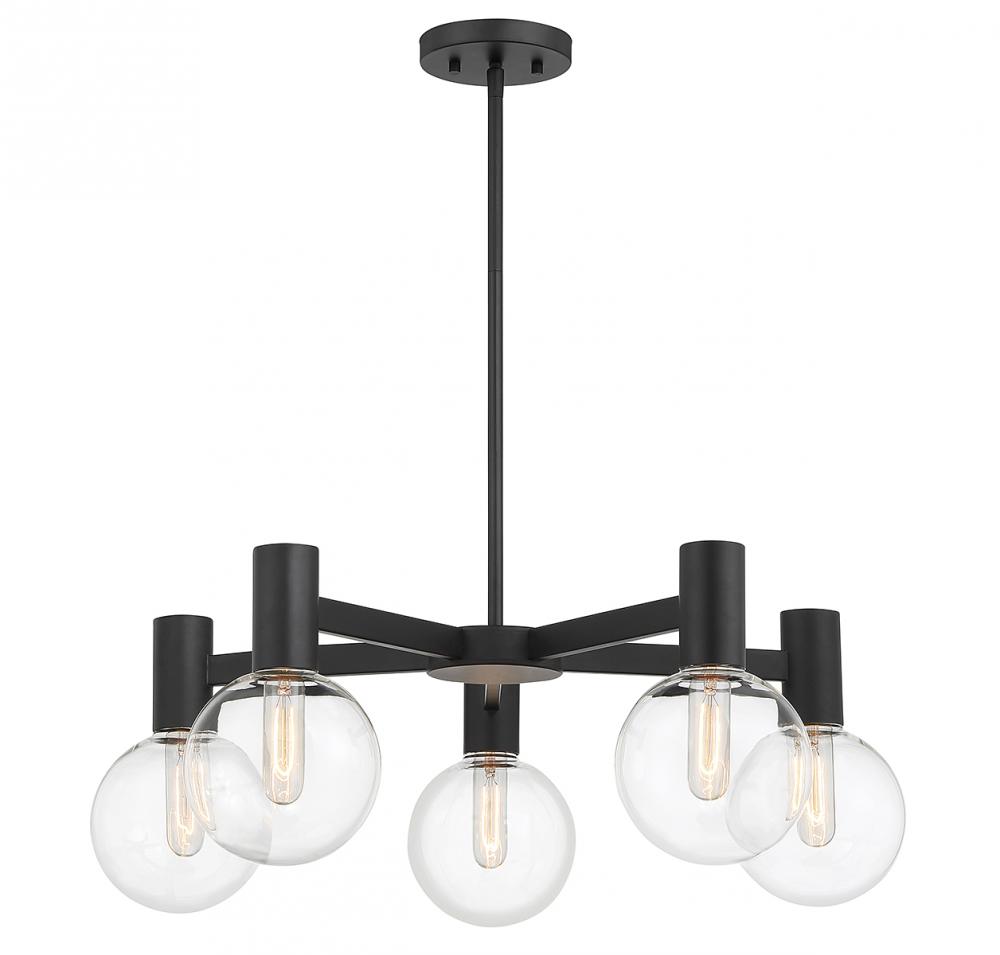 This Savoy House Wright 5-light chandelier showcases streamlined style that makes it ideal for any space. Round clear glass shades add an extra dimension and extra protection for the light bulbs within. Matte black finish. Wright is 28" in width and has an adjustable height ranging from 10.5" to 64". Comes with four 12" downrods and one 6" downrod. Uses 5 standard size bulbs of up to 60 watts per bulb (bulbs not included). We recommend using tubular shaped bulbs.