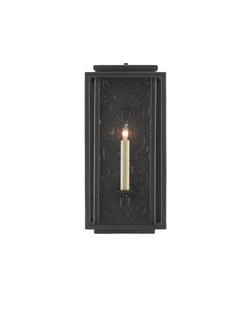 The Wright Small Outdoor Wall Sconce in our Twelfth Street collection of outdoor lighting is similar to our Tanzy sconces but with an added armature surrounding the fixture to bring it an arts and crafts feel. It features a high-performance, weather-resistant Trilux finish that is fade resistant, crack resistant and rust resistant. We guarantee the finishes applied to our Twelfth Street pieces for five years. The metal on this black wall sconce in a midnight finish surrounds seeded-glass panes. It is certified for outdoor and damp locations.