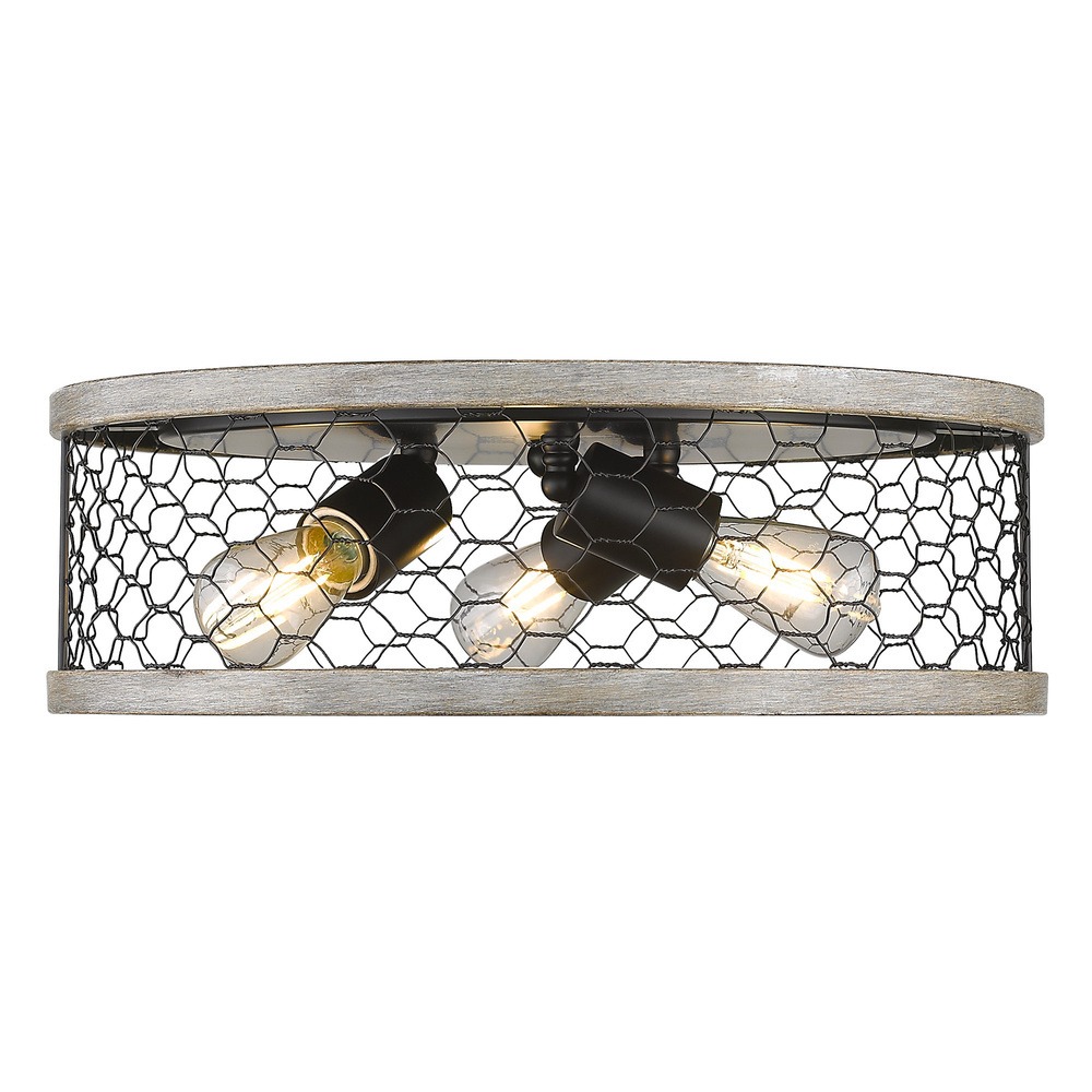 Bring rustic charm into your home with the Wry Lighting Bailey 3-light Flush Mount. Featuring a metal shade and a Matte Black frame, it creates a warm and inviting atmosphere. The metal shade, adorned with rustic chicken wire, provides a textured element that allows light to filter through, creating a cozy environment while highlighting the fixture’s stylish design. Our Matte Black finish exemplifies timeless versatility, enhancing both modern and traditional decors with its smooth surface. Ideal for low ceilings in hallways, bathrooms, and other compact spaces, this fixture is damp location rated for occasional moisture. It requires three E26 Medium base bulbs, not included, with a maximum wattage of 60 per bulb. Overall dimensions are 15"W x 4.75"H x 15"D. Enjoy the fusion of quality craftsmanship and charming details that elevate your home’s lighting solutions.