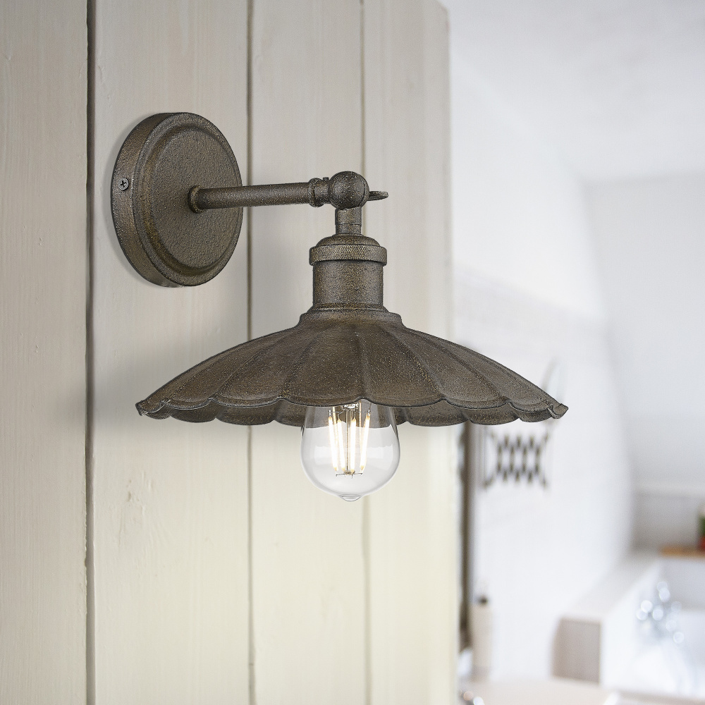 Bring farmhouse elegance into your home with the Wry Lighting Clemence 1-light Wall Sconce in Dark Rust. Featuring a metal shade and a dark rust frame, it creates a welcoming atmosphere. The metal shade beautifully complements the overall design, casting a warm, inviting light throughout your space. Its heavy, granular texture and deep brown-black base are integrated with coppery-orange flecks, creating a weathered, rustic appearance. The dark rust finish adds rugged character, perfect for adding a touch of industrial charm to your decor. This wall sconce is damp location rated, making it suitable for areas with occasional moisture, such as bathrooms or covered porches. The adjustable directional heads allow you to customize the lighting to highlight specific areas or objects, providing versatility in any setting. Overall Dimensions: 9.75"W x 7.13"H x 10.13"D. Requires 1 E26 Medium base bulb (not included, max 100 watt). This product reflects quality craftsmanship, adding both charm and function to your living space.