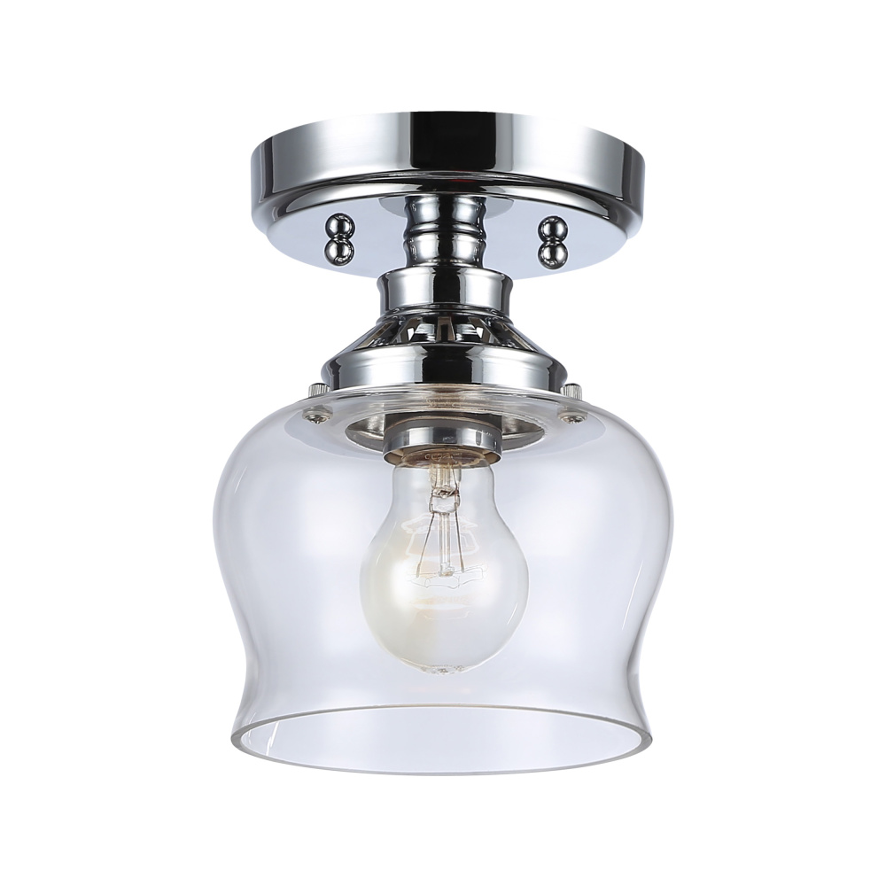 Bring transitional elegance into your home with the Wry Lighting Daphne 1-light Semi-Flush Mount in Chrome. Featuring a glass shade and a polished Chrome frame, it creates a welcoming atmosphere. The clear glass shade provides brilliant, unobstructed light, showcasing the beauty of the bulb. With its polished Chrome finish, this fixture offers a high-shine look that enhances contemporary spaces. Suitable for damp locations, it is perfect for entryways, bedrooms, kitchens, and living areas with mid-height ceilings. Requires 1 E26 Medium base bulb (not included) with a maximum wattage of 60. Overall dimensions are 6"W x 7.63"H x 6"D. Elevate your home decor with quality and style.
