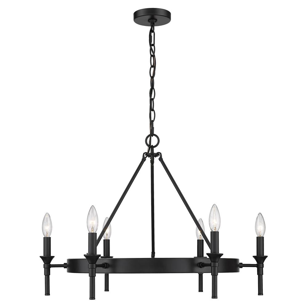 Bring streamlined elegance into your home with the Wry Lighting Edinburgh 6-light Chandelier. Featuring a sleek Matte Black finish, it creates a welcoming atmosphere. The design reinterprets the classic "wagon wheel" silhouette with clean lines, offering a sophisticated look that perfectly balances modern and transitional styles. Ideal for dry locations, it is best suited for indoor spaces such as dining rooms and living areas. This chandelier is sloped-ceiling compatible and adjustable in height, making installation a breeze. Overall Dimensions: 27.25"W x 19.25"H x 27.25"D. Requires 6 E12 Candelabra base bulbs (not included) with a max wattage of 60 per bulb. Enhance your home decor with the quality and beauty of the Edinburgh chandelier, making it a true centerpiece.
