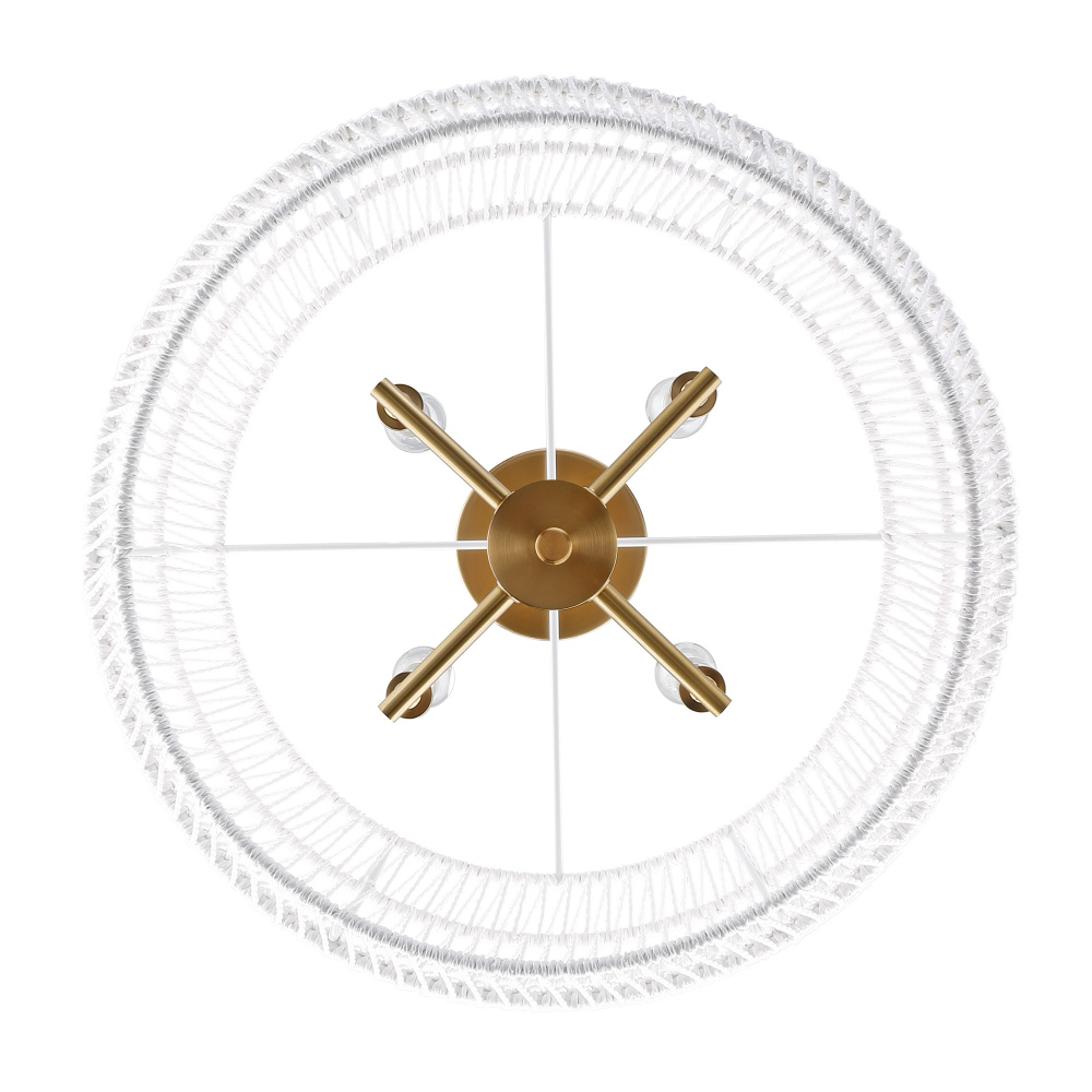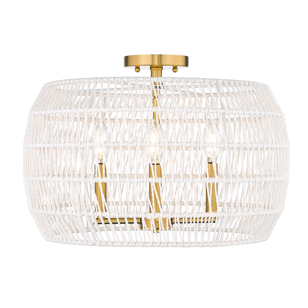 Bring coastal sophistication into your home with the Wry Lighting Ellie 4-light Semi-Flush Mount. Featuring a rope shade and a modern brushed gold frame, it creates a welcoming atmosphere. The bleached white raphia rope shade brings a breezy, natural vibe, enhancing light diffusion and infusing your space with an airy feel. Our modern brushed gold finish adds a touch of luxe and contemporary appeal with its soft sheen that beautifully disperses light. This semi-flush mount is perfect for entryways, bedrooms, kitchens, and living areas with mid-height ceilings. It is damp location rated, making it suitable for covered areas with occasional moisture. The convertible construction provides flexible installation for varying ceiling clearances, ensuring it fits seamlessly in your home. Overall Dimensions: 19"W x 13.25"H x 19"D, Requires 4 E12 Candelabra base bulbs (not included), max 60 watts per bulb. Combining style and practicality, this semi-flush mount light offers an elegant touch to your spaces with the quality and craftsmanship you expect from Wry Lighting.
