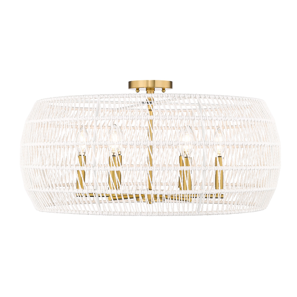 Bring coastal elegance into your home with the Wry Lighting Ellie 6-light Semi-Flush Mount. Featuring a rope shade and a modern brushed gold frame, it creates a welcoming atmosphere. The bleached white raphia rope shade offers a breezy, coastal vibe, enhancing the intricate texture and organic appearance that draws attention and admiration. Our modern brushed gold finish exudes a radiant warmth, enhanced by a satin sheen that beautifully diffuses light, creating an inviting glow throughout your space. This versatile light fixture is suitable for entryways, bedrooms, kitchens, and living areas with mid-height ceilings. Damp-location rated, it’s perfect for covered and semi-enclosed spaces, such as bathrooms and laundry rooms. Convertible with an adjustable height design, you can install it as either a semi-flush mount or a pendant to fit your space perfectly. Overall dimensions are 27.13"W x 13.25"H x 27.13"D, requiring 6 E12 candelabra base bulbs (not included) with a maximum wattage of 60 per bulb. Elevate your home decor with this stunning and practical lighting fixture.