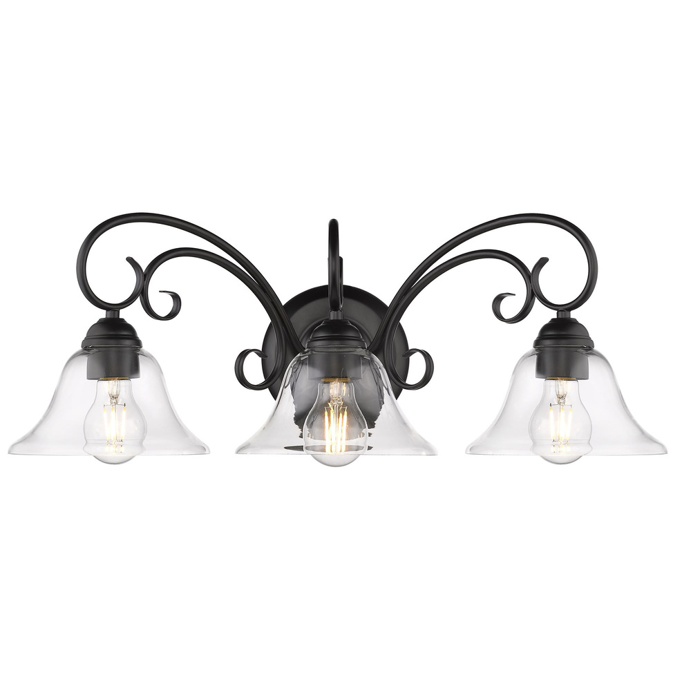 Bring Traditional elegance into your home with the Wry Lighting Homestead 3-light Vanity in Matte Black. Featuring a glass shade and a matte black frame, it creates a welcoming atmosphere. The clear glass shade offers brilliant, unobstructed light, showcasing the beauty of the bulb and fixture's design. Its epitome of clean, modern style has a timeless appeal, complementing both minimalist and industrial decor. This versatile fixture is damp location rated, making it suitable for covered spaces with occasional moisture, such as bathrooms and laundry rooms. Installation is straightforward, with overall dimensions of 24"W x 9"H x 11"D, requiring 3 E26 Medium base bulbs (not included), with a maximum wattage of 100 per bulb. Enhance your bathroom with this elegant and functional piece that radiates quality and charm.