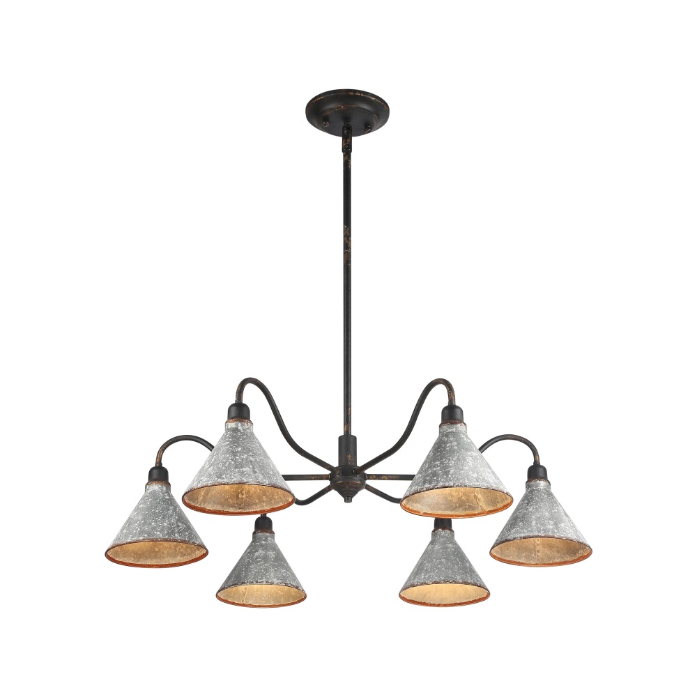 Bring traditional elegance into your home with the Wry Lighting Jasper 6-light Chandelier in Antique Black Iron. Featuring a metal shade and a rustic Antique Black Iron frame, it creates a welcoming atmosphere. This striking metal shade features a heavily textured galvanized steel exterior in mottled gray with chalky white speckles and rust accents, paired with an antiqued golden-orange interior that casts a warm, inviting light. Capture the raw charm of a bygone era with the Antique Black Iron finish, artfully weathered to reveal glimpses of a warm, antiqued gold base beneath. This bold finish enhances any industrial, rustic, or farmhouse decor, making a substantial statement in your space. Ideal for dining rooms, foyers, or living spaces, this chandelier is dry location rated for areas not subject to moisture. With a convertible design, you can easily install it as a semi-flush mount or pendant, with an adjustable height ranging from 12 to 54 inches. Overall Dimensions: 37.88"W x 9.63"H x 37.88"D. Requires 6 E26 Medium base bulbs (not included), max 60 watts per bulb. Each piece is handcrafted, making each chandelier uniquely charming while providing ample illumination for gatherings.