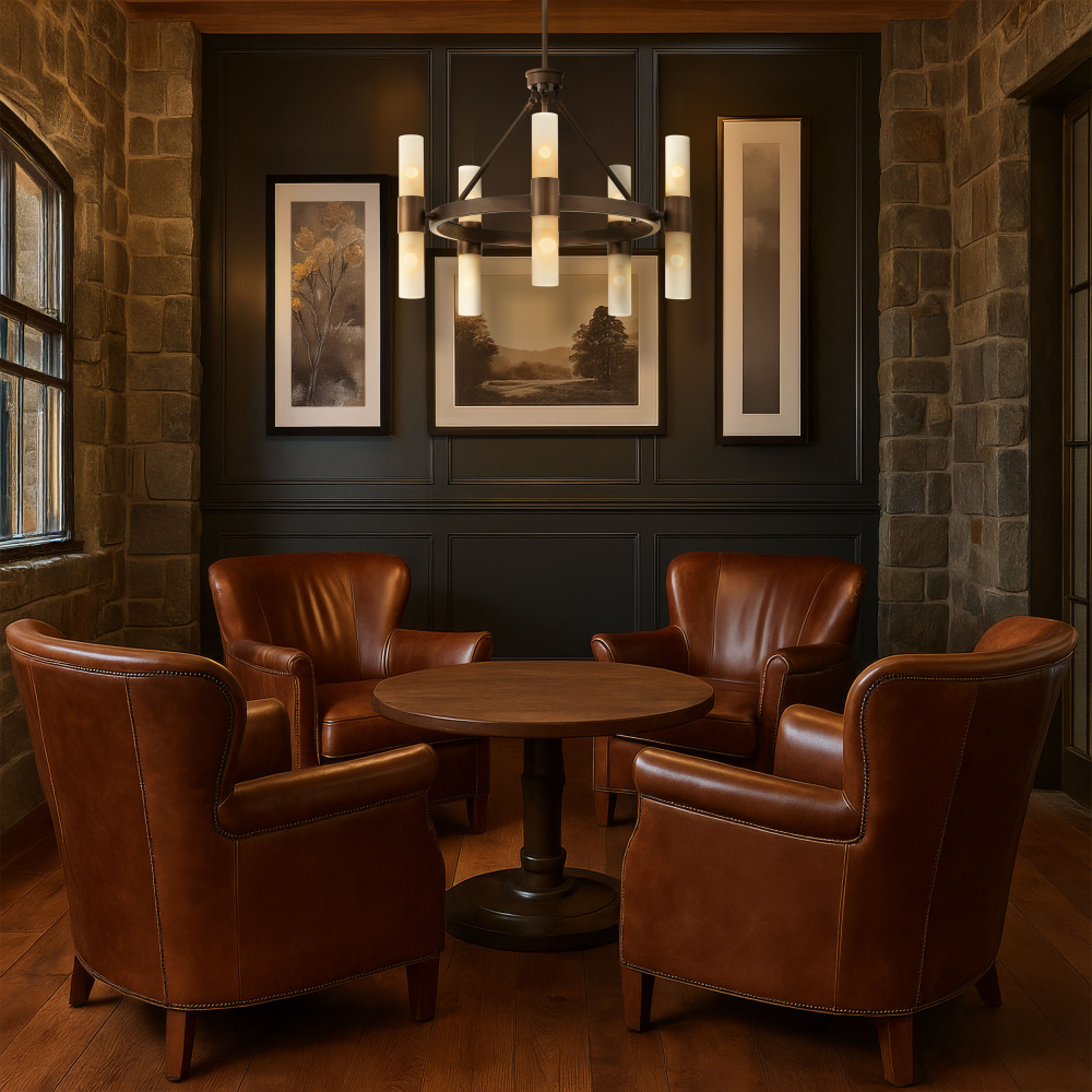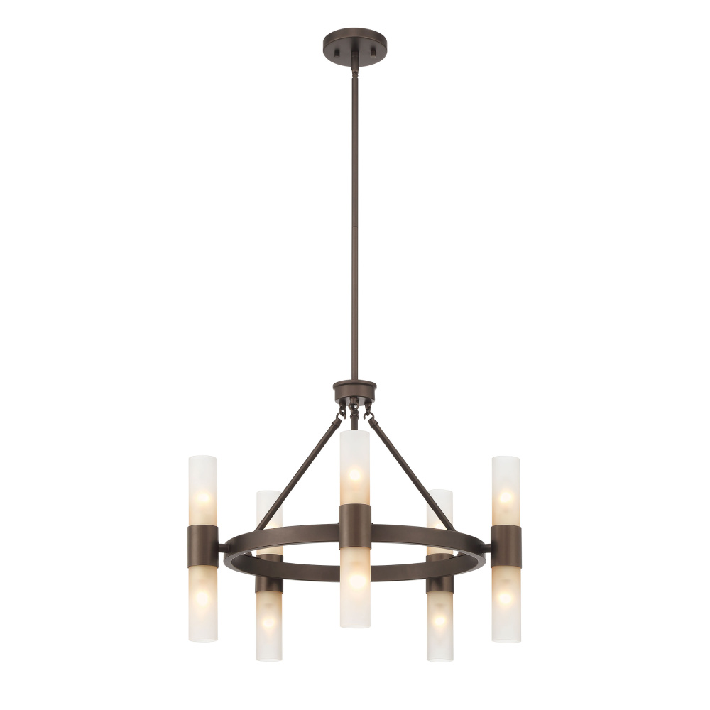Bring Modern elegance into your home with the Wry Lighting Lyssna Cirkel 10-light Chandelier in Modern Bronze. Featuring exquisite glass shades and a sleek bronze finish frame, it creates a captivating atmosphere. The glass shades, featuring an Etched Bronze Ombre effect, provide a beautiful gradient light, transitioning from frosted white to a warm bronze hue. This design ensures a soft, diffused glow that's perfect for ambiance. Our Modern Bronze finish showcases a sophisticated chocolate brown hue, ideal for contemporary interiors and pairs effortlessly with various color palettes. This chandelier is Dry Location Rated, making it ideal for indoor spaces such as bedrooms, living rooms, and dining areas. It is also sloped-ceiling compatible with an adjustable height from 27.75" to 63.75". The overall dimensions are 24"W x 19"H x 24"D, requiring 10 E12 Candelabra base bulbs. Elevate your space with this stunning centerpiece, adding both charm and modern sophistication.