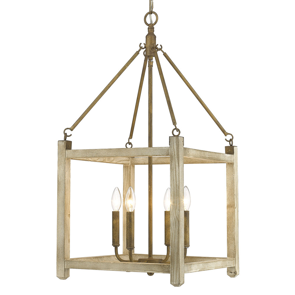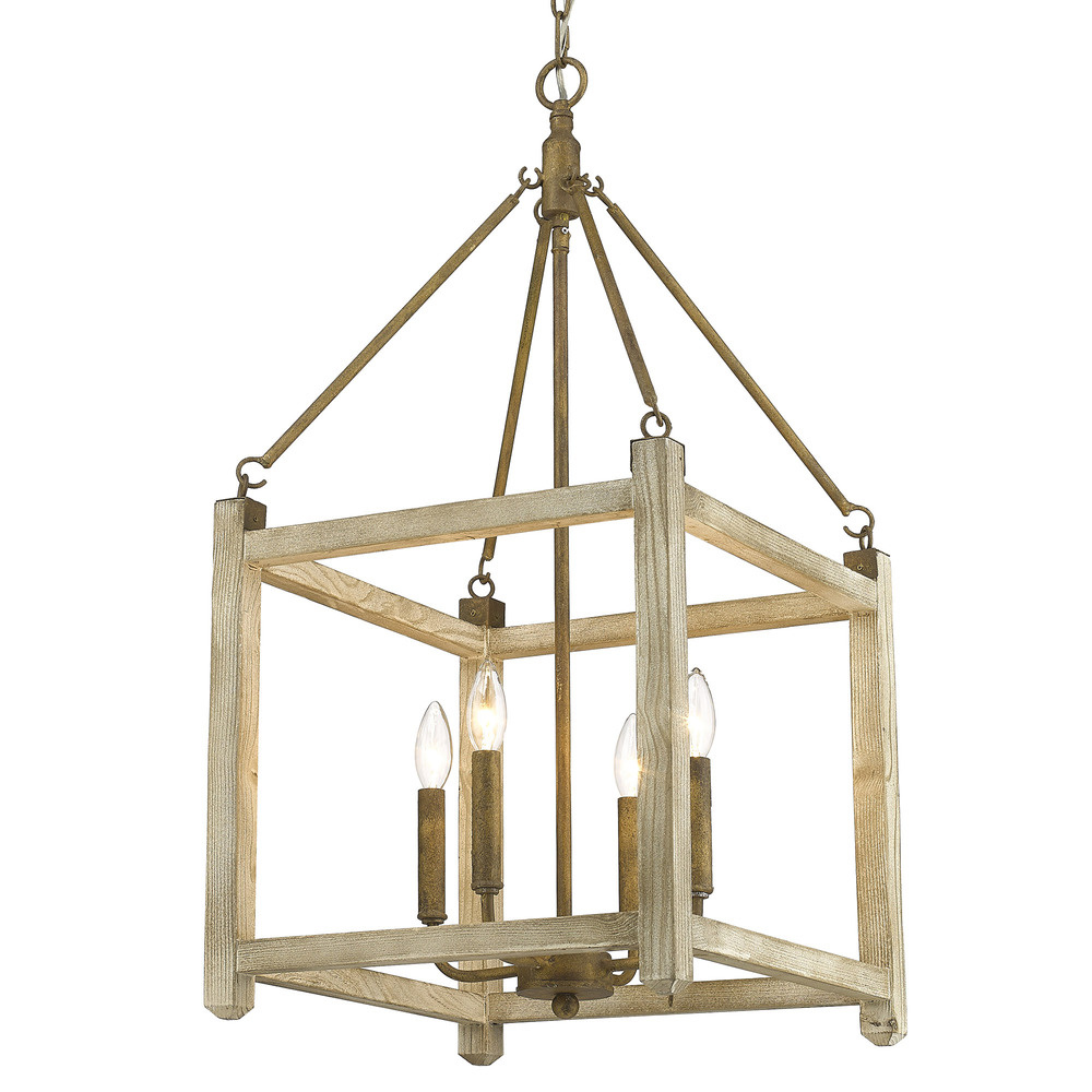 Bring farmhouse charm into your home with the Wry Lighting Orville 4-light Pendant. Featuring a burnished chestnut finish, it creates a welcoming atmosphere. This fixture showcases an open-cage design that invites a warm glow, highlighting the warm, substantial feel of the burnished chestnut finish. This rich brown shade enhances the space with its antique gold highlights, adding timeless tradition to any setting. Perfect for indoor spaces, it is Dry Location Rated, making it ideal for bedrooms, living rooms, and hallways. Designed to be sloped ceiling compatible, it offers adjustable heights from 33.5" to 105.5". Overall Dimensions: 16.25"W x 32.5"H x 16.25"D. Requires 4 E12 Candelabra base bulbs (not included), max wattage 60 per bulb. Elevate your décor with this stylish pendant, quintessential for creating a cozy atmosphere in any home.