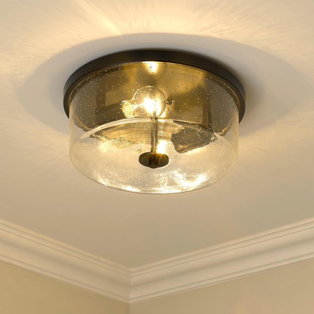 Bring farmhouse elegance into your home with the Wry Lighting Rayne 2-light Flush Mount in Matte Black. Featuring a glass shade and a matte black frame, it creates a welcoming atmosphere. The seeded glass shade adds a touch of vintage character and artisanal charm. When illuminated, the 'seeds' catch the light, creating a brilliant sparkle and gently diffusing the bulb's glow for a warm, inviting ambiance. The matte black finish is timeless and versatile, providing a smooth, non-reflective surface that complements various decor styles. Ideal for low ceilings in hallways, closets, laundry areas, and bathrooms. Damp Location Rated, it's suitable for covered and semi-enclosed spaces with occasional moisture. Overall Dimensions: 12.63"W x 5.38"H x 12.63"D. Requires 2 E26 Medium base bulbs (not included), Max 60 wattage per bulb. Close with an inviting touch and quality craftsmanship that enhances your living area.