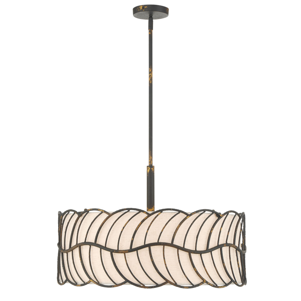 Bring farmhouse elegance into your home with the Wry Lighting Simbolo 5-light Pendant in Antique Black Iron. Featuring a fabric shade and a rugged Antique Black Iron finish, it creates a welcoming atmosphere. The ivory linen fabric shade provides a soft, tailored look, skillfully diffusing light to enhance your space with a warm glow. This timeless hue and natural texture ensure that your lighting feels both relaxed and refined. The Antique Black Iron finish captures the authentic charm of a bygone era, showcasing a heavily pitted and crackled surface for added character. Its industrial appeal perfectly complements rustic and farmhouse designs. Ideal for dry locations like bedrooms, living rooms, and hallways, this pendant is easily adjustable in height and compatible with sloped ceilings, ensuring seamless installation. Overall dimensions are 24"W x 15"H x 24"D, and it requires 5 E26 Medium base bulbs (not included), max 60 wattage per bulb. Elevate your home with artisanal craftsmanship and a touch of age-old charm.