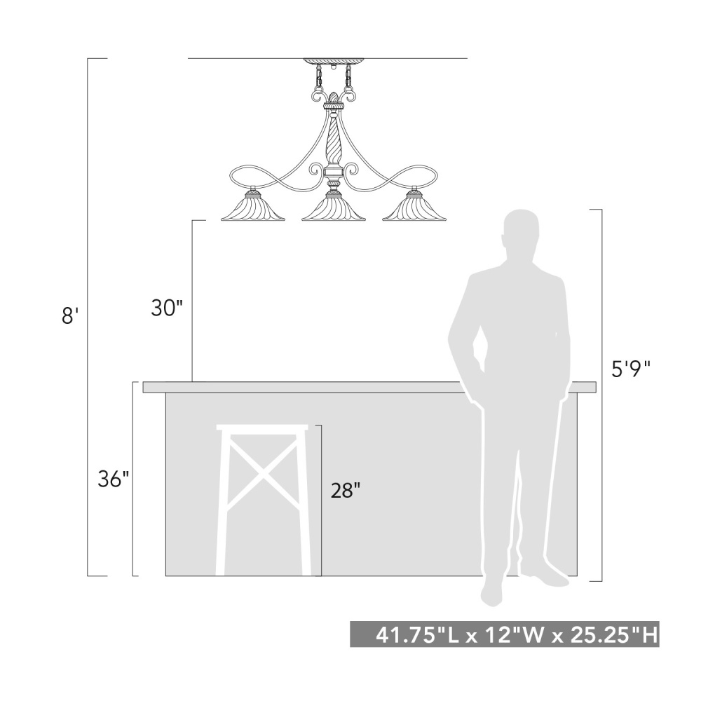 Transform your space with the Wry Lighting Torbellino 3-light Island Light in Cordoban Bronze. Featuring stunning Remolino glass, this fixture adds a touch of sophistication and elegance. The Remolino glass showcases graceful swirling textures that enhance the light play, providing a soft, warm ambiance. Designed with rich details, this island light captures classic forms while visually blending dynamic elements, making it a centerpiece in any setting. The Cordoban Bronze finish, inspired by old-world Spanish leathers, adds warmth and artisan character, courtesy of its elegant brushed texture. This light is rated for dry locations, ideal for use in indoor spaces like dining rooms, kitchens, or entryways. It is sloped-ceiling compatible and offers an adjustable height from 28.5" to 98.5", facilitating seamless installation. With overall dimensions of 41.75"W x 25.25"H x 12"D, and requiring 3 E26 medium base bulbs (not included), this fixture illuminates beautifully while complementing your home’s decor. Elevate your threshold of style with the Wry Lighting Torbellino, an exquisite blend of artistry, quality, and timeless appeal.