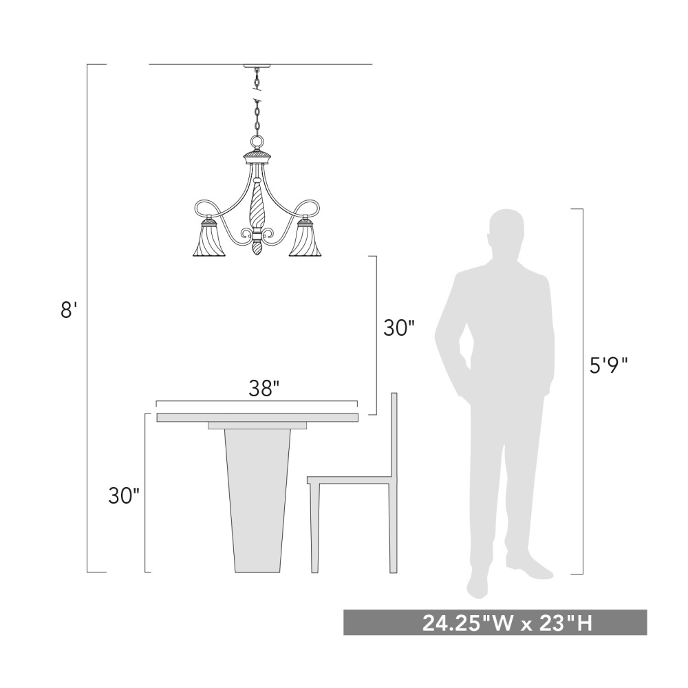 Bring traditional elegance into your home with the Wry Lighting Torbellino 5-light Chandelier in Cordoban Bronze. Featuring a glass shade and a Cordoban Bronze frame, it creates a welcoming atmosphere. The glass shade showcases exquisite Remolino glass, which features a dynamic swirling texture that creates beautiful light play and a soft, warm ambiance. Capture the beauty of elegant motion with this unique finish, allowing graceful, swirling ribs to wrap around the shade for a sense of dynamic movement. The soft, satin finish of the warm, creamy glass beautifully diffuses light, casting an inviting glow while minimizing glare. Inspired by the rich, hand-rubbed leathers of old-world Spain, the Cordoban Bronze finish exudes warmth and artisan character. This timeless choice adds a touch of classic sophistication and warmth to any interior setting. Make a grand impression in dining rooms and foyers, or elevate your bedrooms and living spaces. This chandelier is dry location rated, ideal for indoor spaces. Its sloped-ceiling compatibility and adjustable height (Min: 24.5"- Max: 96.5") make installation easy and customizable. Overall dimensions are 24.25"W x 23"H x 24.25"D, and it requires 5 E26 Medium base bulbs (not included) with a maximum wattage of 100 per bulb. Experience the elegant craftsmanship and timeless charm that this chandelier adds to your home.