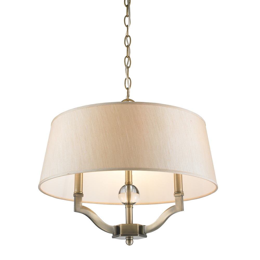 Bring transitional elegance into your home with the Wry Lighting Waverly 3-light Semi-Flush Mount in Aged Brass. Featuring a fabric shade and an Aged Brass frame, it creates a welcoming atmosphere. The Silken Parchment fabric shade casts a warm, inviting glow with its creamy off-white color and fine, horizontally slubbed texture, enhancing the lighting effect beautifully. Embrace timeless elegance with our Aged Brass finish, offering a sophisticated surface that beautifully catches and diffuses light. Ideal for entryways, bedrooms, kitchens, and living areas with mid-height ceilings, this light fixture is Dry Location Rated for indoor spaces not subject to moisture. Its Convertible Design allows for installation as a semi-flush mount or pendant, with an adjustable height to accommodate sloped or flat ceilings. Overall Dimensions: 19"W x 14.75"H x 19"D. Requires 3 E12 Candelabra base bulbs (not included) with a maximum of 60 watts per bulb. Elevate your home décor with this stylish and easy-to-install fixture, adding a touch of classic luxury.