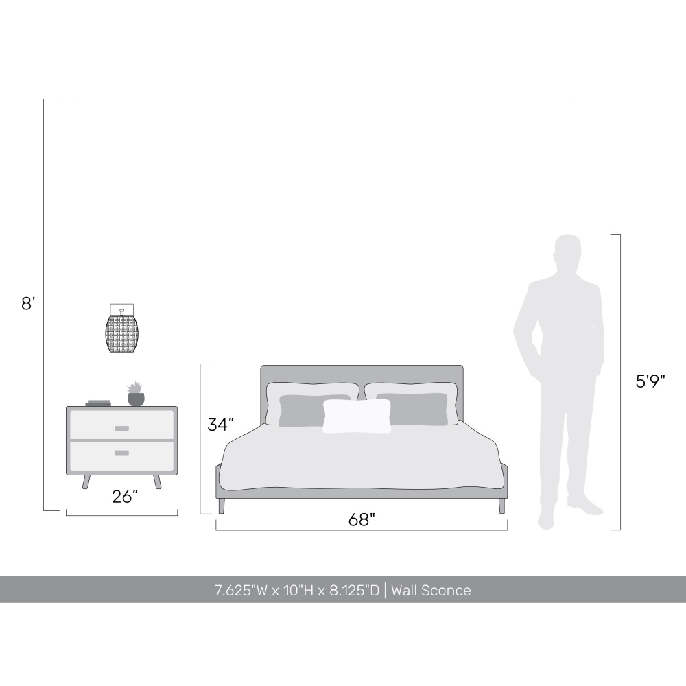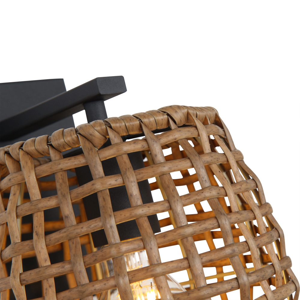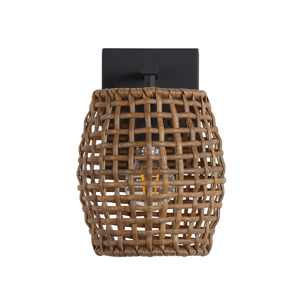 Bring a free-spirited elegance into your home with the Wry Lighting Weavelight 1-light Wall Sconce. Featuring a wicker shade and a Natural Black frame, it creates a welcoming atmosphere. The Maple All-Weather Wicker shade showcases a warm, honey-brown color with natural variations, woven into an airy pattern that playfully interacts with light. Our Natural Black finish offers a softer, organic look with a slightly faded appearance reminiscent of dark charcoal. Perfect for enhancing hallways, stairways, and bathrooms, this fixture is Damp Location Rated for covered and semi-enclosed spaces. It requires 1 E26 Medium base bulb (not included), with a maximum wattage of 100. Overall dimensions are 6.75"W x 10"H x 8.13"D. Experience the artisan charm and quality craftsmanship with this unique wall sconce.