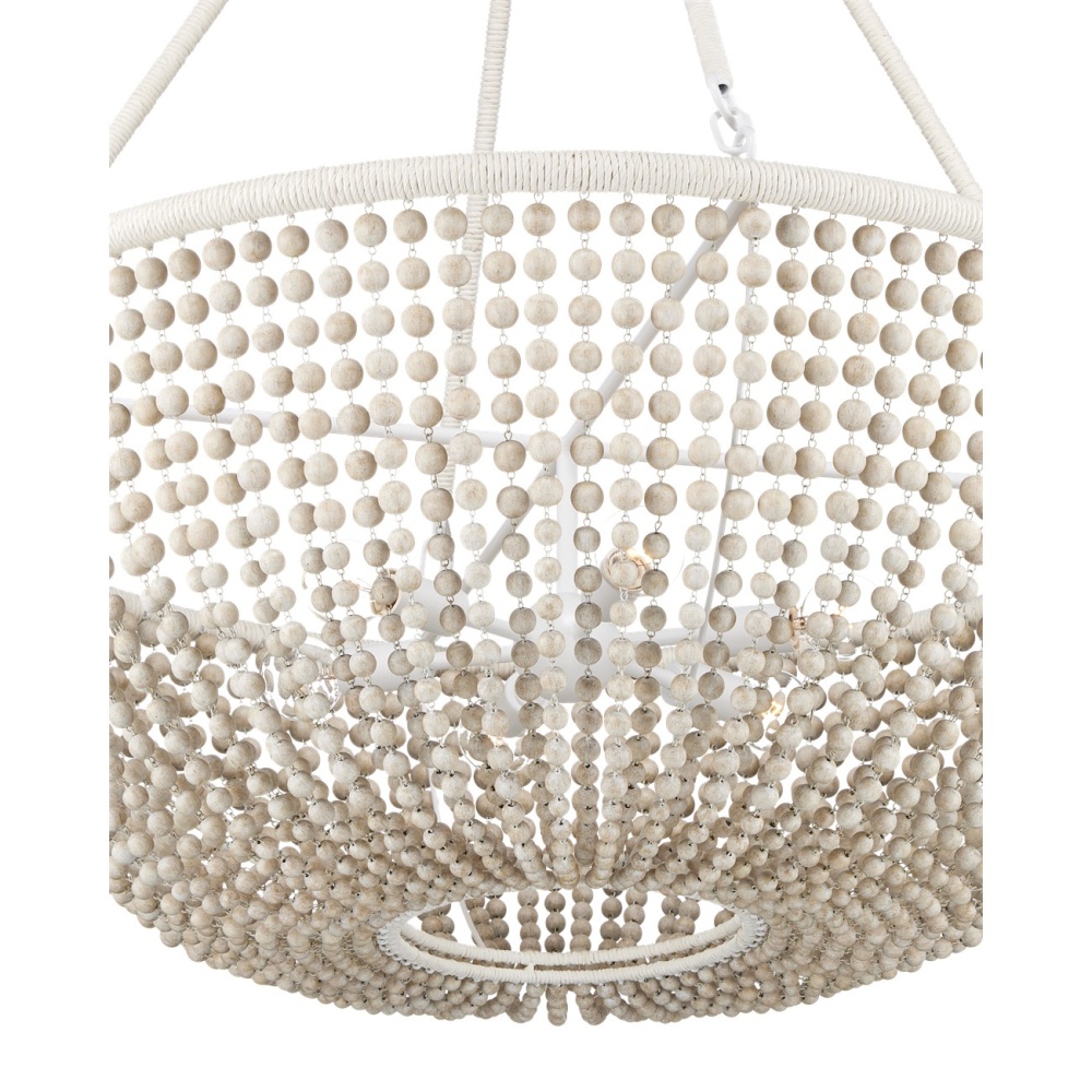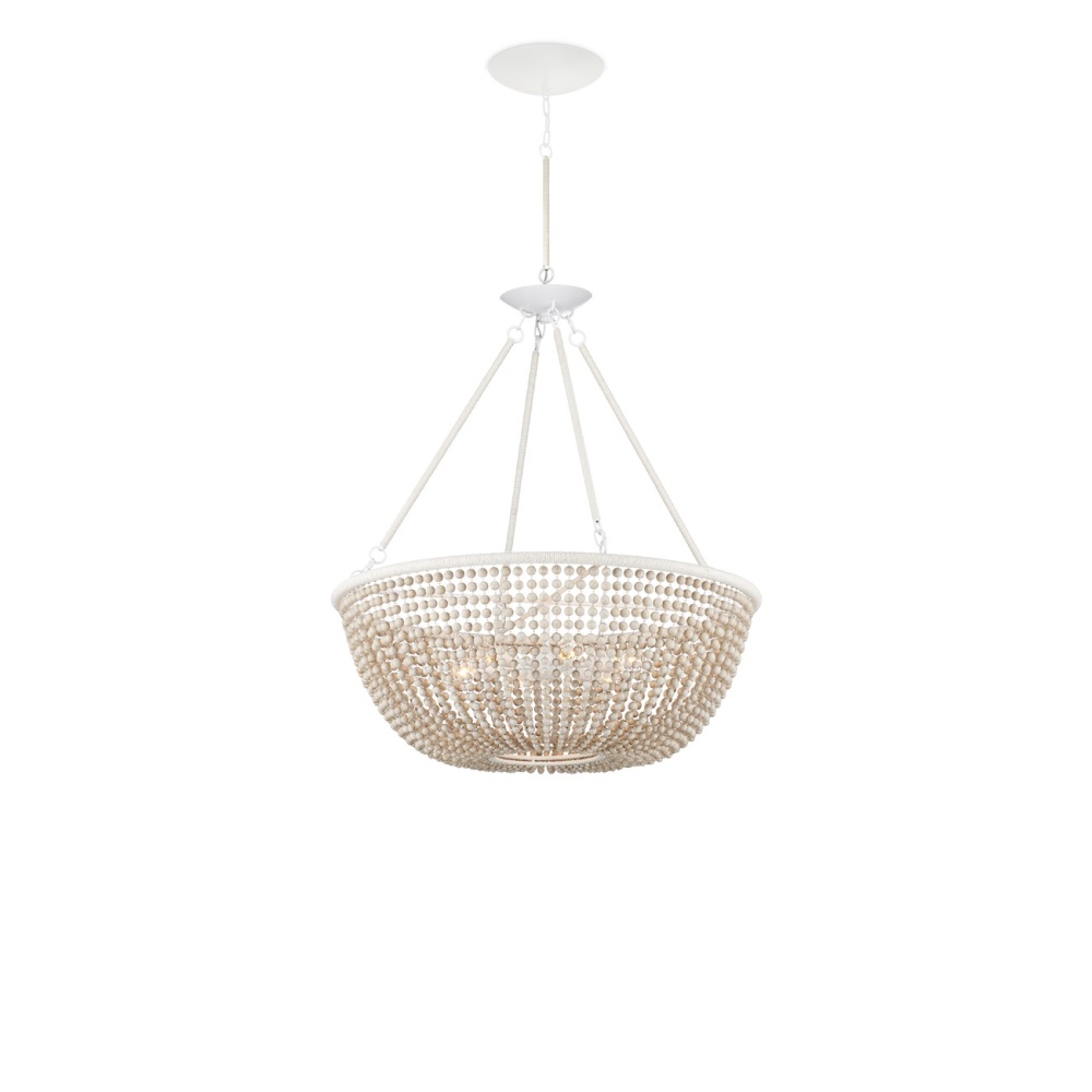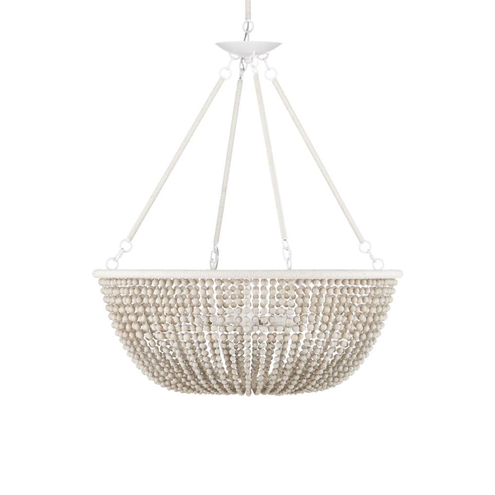 The Wychwood Chandelier is a classic shape that holds swags of wooden beads between its top and bottom rings. Several materials and finishes are in play on this design -- the sugar white finish on the wrought iron, the sandstone finish on the beads, and the Kraft paper twine wrapped around the rings themselves. Adjustable from 42.25" to 123" with use of included chain/rod kit/cable. If your space calls for a longer drop, additional chain/rods/cable is available for purchase.