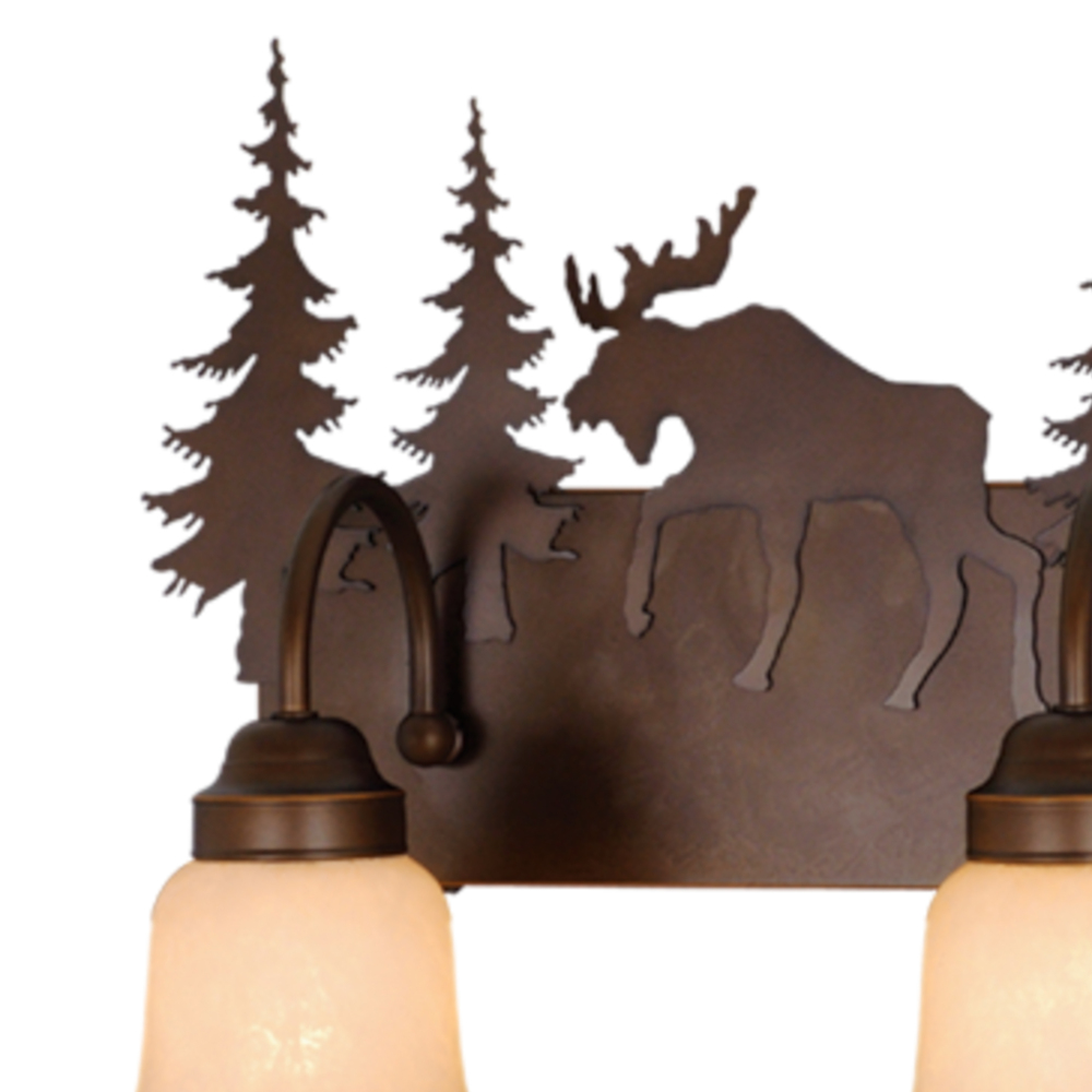 Evoking the spirit of the wilderness, this rustic themed light is clad in a burnished bronze finish and features silhouetted moose imagery atop glowing amber flake glass. It is a great choice for a vacation lodge, cabin or suburban home and will complement a variety of home styles: anywhere you want to bring an element of nature. This bathroom light is perfect over small vanities or as a pair over double sinks. The full back plate creates the perfect solution to any space where a larger back plate is needed.