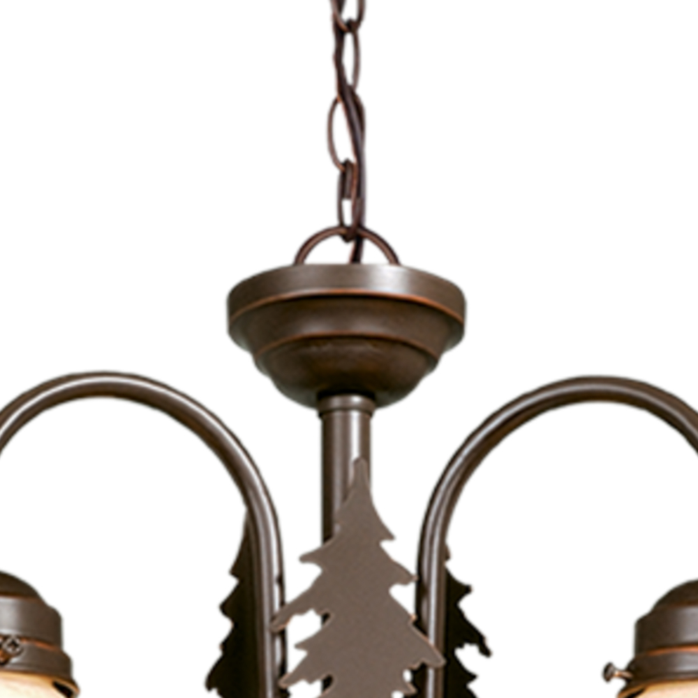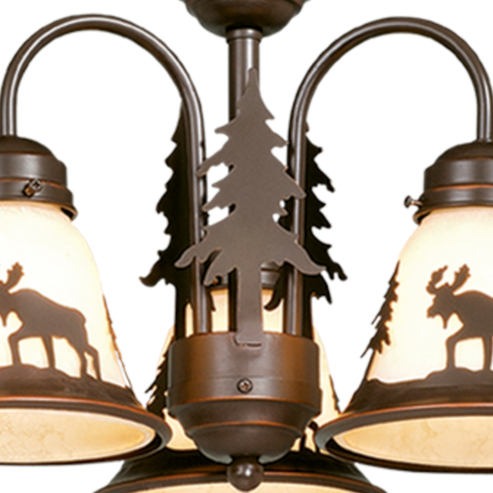 Evoking the spirit of the wilderness, this rustic themed light is clad in a burnished bronze finish and features silhouetted tree and moose imagery atop glowing amber flake glass. It is a great choice for a vacation lodge, cabin or suburban home and will complement a variety of home styles: anywhere you want to bring an element of nature. This versatile fixture can be installed two ways; mount as a ceiling fan light kit (check compatibility with your fan) or use the chain to mount as a mini chandelier. Pull chain on-off switch or wall switch controlled.