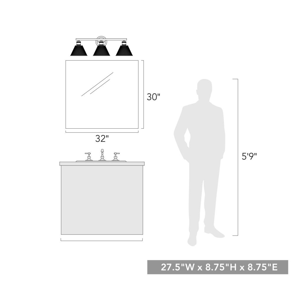 Bring modern industrial elegance into your home with the Yep by Golden Lighting Carver 3-light Vanity in Rubbed Bronze. Featuring a stunning metal shade and rich rubbed bronze finish, it creates an inviting atmosphere in your bathroom or laundry area. This industrial-style fixture showcases a cone-shaped metal mesh shade, celebrating the beauty of exposed bulbs and providing a warm, inviting glow. Its rubbed bronze finish adds classic warmth and depth, with subtle brushed highlights creating a striking visual effect. Perfect for brightening up bathrooms, this vanity light is damp location rated, making it suitable for spaces with occasional moisture, such as bathrooms and covered porches. While it may not have adjustable height features, it provides a versatile design fitting for covered and semi-enclosed environments. Overall Dimensions: 27.5"W x 8.75"H x 8.75"D. Requires three E26 medium base bulbs (not included), with a maximum wattage of 60 per bulb. Transform your space with this beautiful combination of functionality and aesthetic appeal.