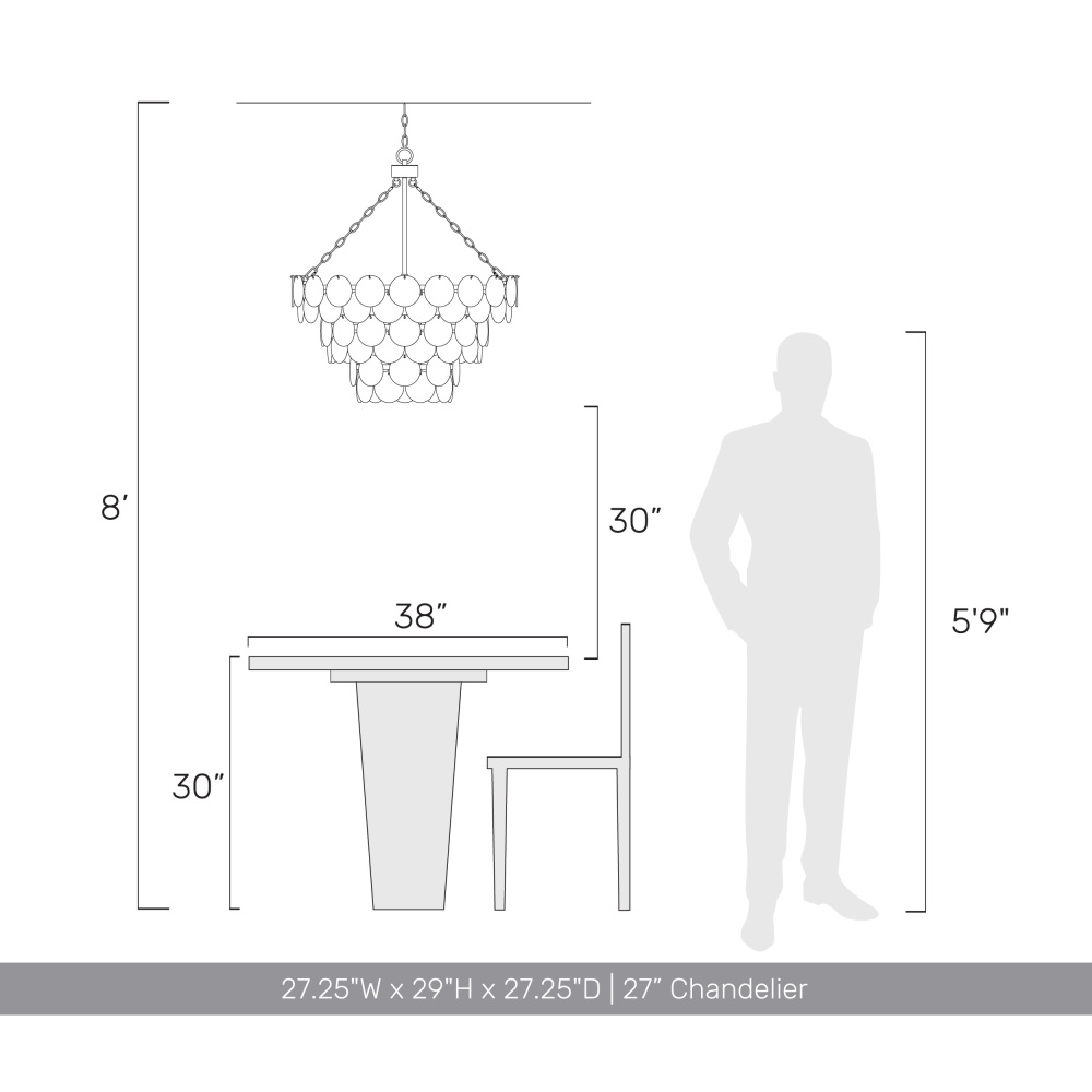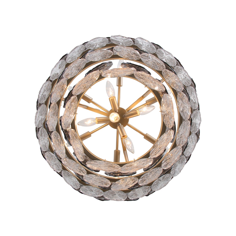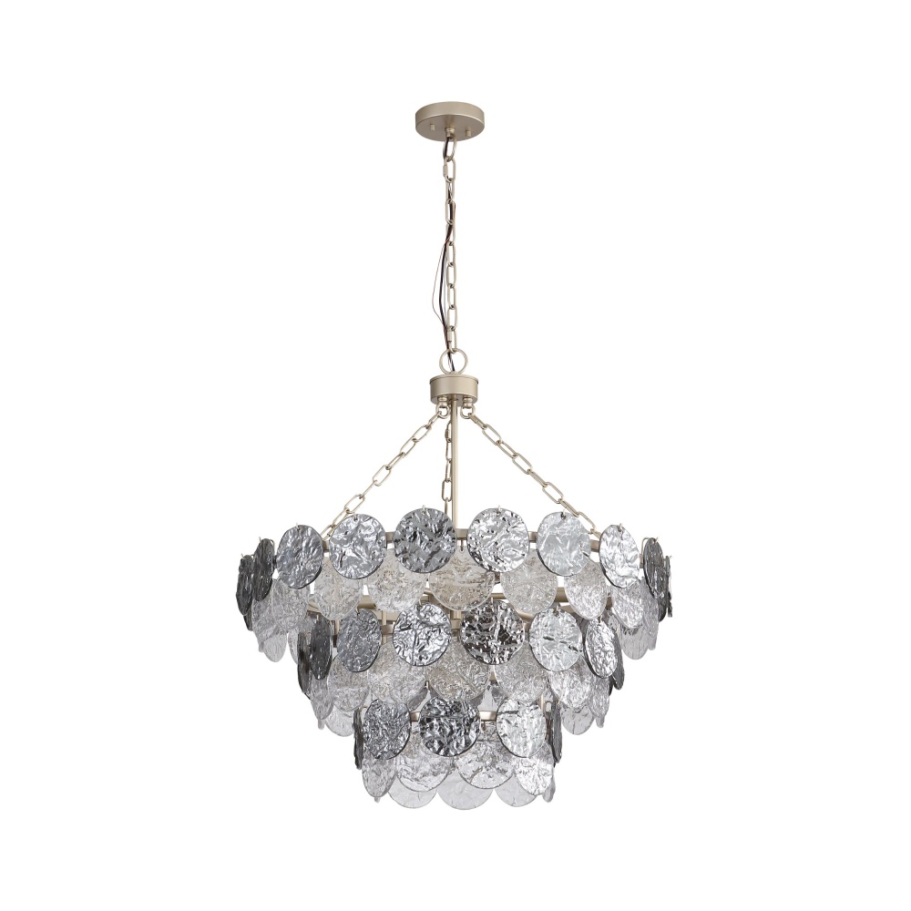 Bring coastal elegance into your home with the Yep by Golden Lighting Cascada 11-light Pendant in Aegean Silver. Featuring a glass shade, it creates a welcoming atmosphere with its shimmering, hammered water glass design. The Smoke Plated Glass shade offers a captivating, dynamic finish that transforms from mirrored to translucent when lit, enhancing the light quality with a moody ambience. Inspired by artisanal metalwork, the Aegean Silver finish features a soft, satin lustre that elegantly catches the light, providing a sophisticated texture that is both timeless and versatile. Perfect for indoor spaces not subject to moisture like bedrooms and living rooms, this fixture is sloped-ceiling compatible and features an adjustable height from 32.5" to 106.5". Overall dimensions are 27.25"W x 29"H x 27.25"D, requiring 11 E12 candelabra base bulbs (not included) with a maximum wattage of 60 per bulb. Elevate your home’s aesthetic with quality craftsmanship that truly stands out.