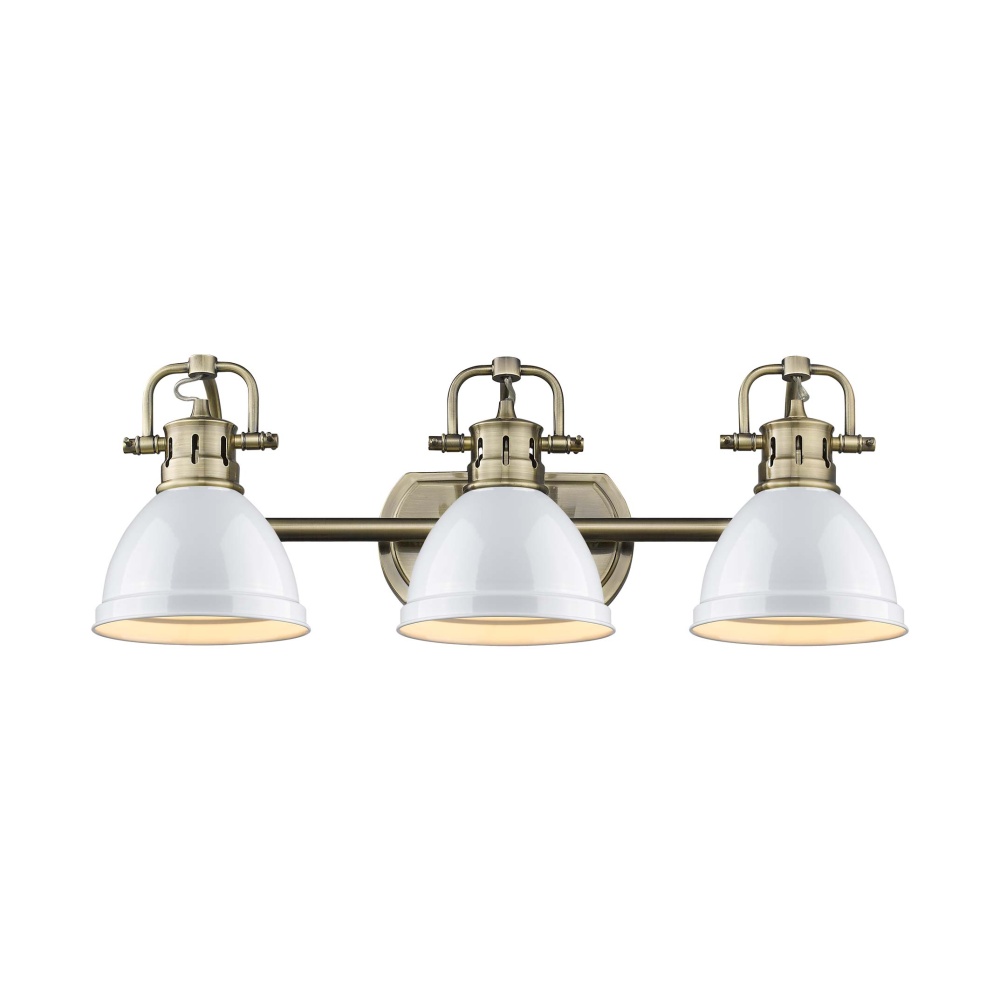 Bring classic elegance into your home with the Yep by Golden Lighting Duncan 3-light Vanity. Featuring a Metal shade and Aged Brass frame, it creates a welcoming atmosphere. The White shade finish offers a smooth, bright contrast, enhancing the light's reflective qualities. The highly polished finish of the White shade ensures excellent light reflection, while the Aged Brass frame delivers a warm glow reminiscent of vintage heirlooms—perfect for a variety of styles, including coastal and modern farmhouse. Designed for spaces like bathrooms and laundry areas, this fixture is Damp Location Rated, making it suitable for spaces with occasional moisture. The Adjustable Directional Heads allow you to customize the lighting by pivoting the individual heads to highlight specific areas or objects. Overall Dimensions: 24.5"W x 8.5"H x 8.25"D. Requires 3 E26 Medium base bulbs (not included), max 100 wattage per bulb. Elevate your spaces with this versatile light fixture that combines style and functionality.