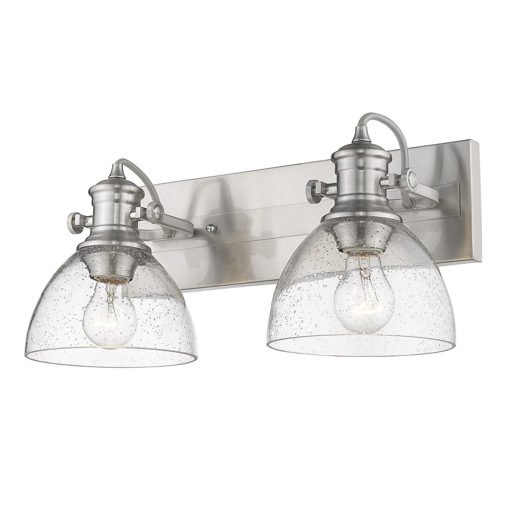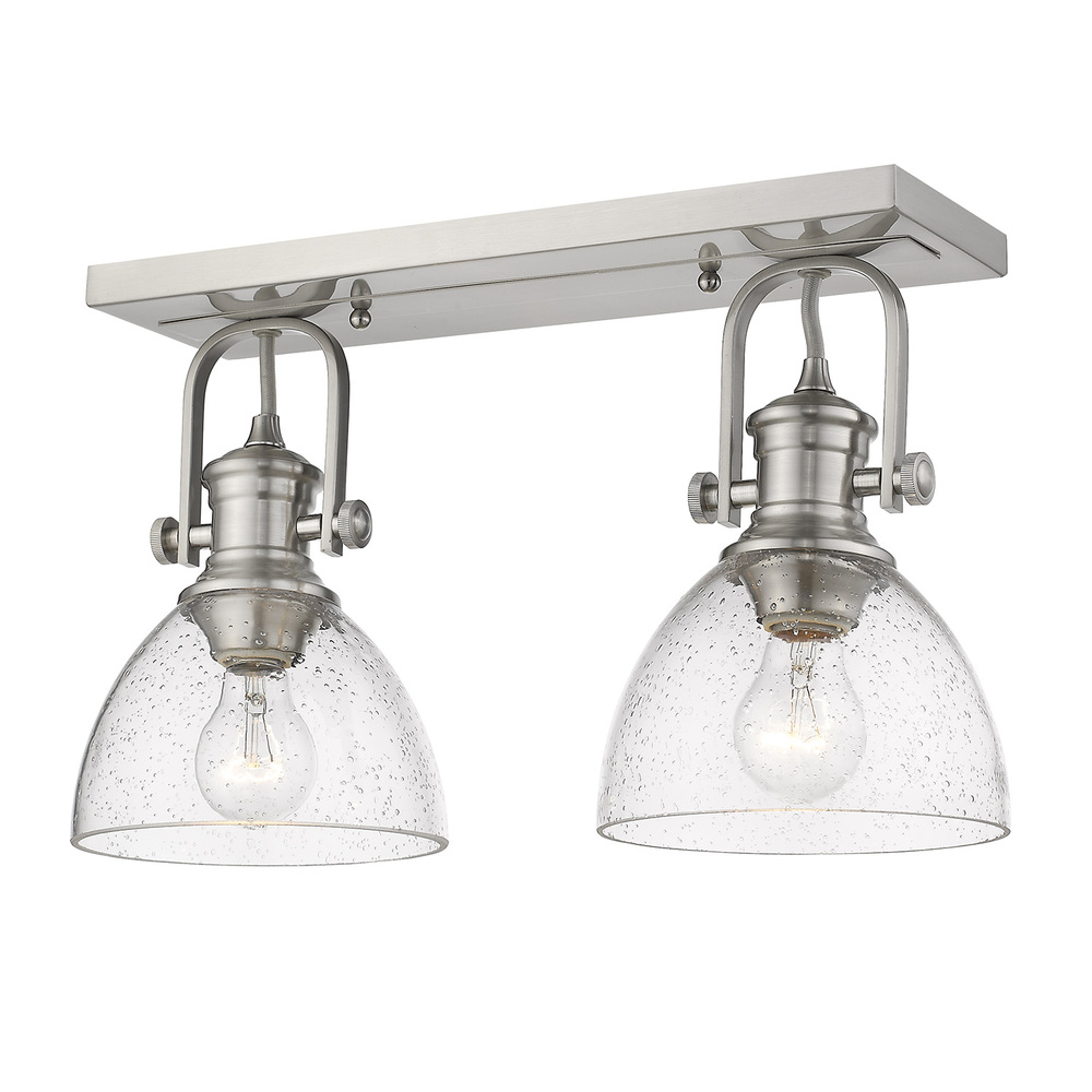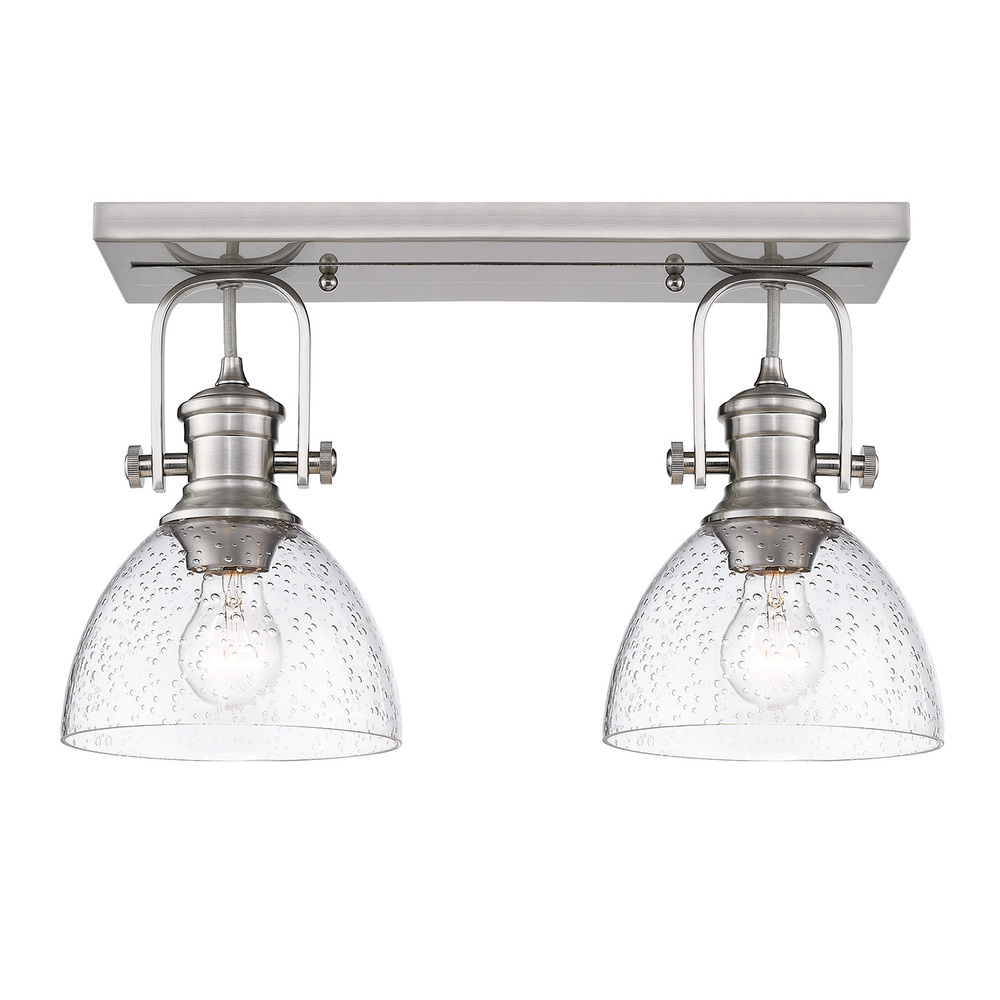 Bring traditional elegance into your home with the Yep by Golden Lighting Hines 2-light Semi-Flush Mount. Featuring a glass shade and a charming Pewter frame, it creates a welcoming atmosphere. The Seeded Glass shade, infused with tiny air bubbles, adds distinctive character that gently diffuses light for an inviting ambiance. The Pewter finish offers a soft and sophisticated glow, making it a versatile choice for both classic and contemporary interiors. Suitable for damp locations, this fixture is ideal for use in bathrooms or covered porches. With adjustable directional heads, you can easily focus light on specific areas. Overall Dimensions: 17.88"W x 10.38"H x 6.88"D. Requires 2 E26 Medium base bulbs (not included), max 60 watts each. Elevate your living space with this beautiful and durable fixture.