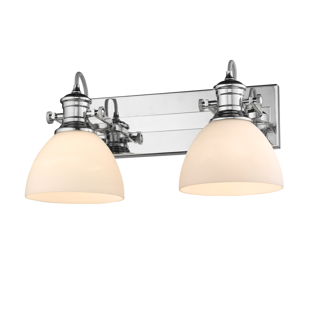 Bring Farmhouse elegance into your home with the Yep by Golden Lighting Hines 2-light Vanity in Chrome and Opal Glass. Featuring a glass shade and a polished chrome frame, it creates a welcoming atmosphere. The Opal Glass shade, with its milky, translucent white color, diffuses light evenly for a soft, glare-free glow, adding a touch of timeless sophistication to your space. Brilliant and timeless, the Polished Chrome finish provides a sleek, clean look that seamlessly integrates into various decor styles. This durable finish is not only easy to clean but also enhances the brightness of any setting. Brighten up your bathroom with dedicated lighting that flatters while providing practical task illumination. Suitable for covered and semi-enclosed spaces with occasional moisture, this fixture is great for bathrooms, covered porches, and laundry rooms. Customize your lighting experience with adjustable directional heads to highlight specific areas, and enjoy the flexibility of up to two E26 Medium base bulbs, each with a maximum of 60 watts. The overall dimensions of this vanity light are 17.88"W x 8.75"H x 8.25"D. Experience warmth and inviting charm that elevates your bathroom lighting with quality craftsmanship and elegant design.