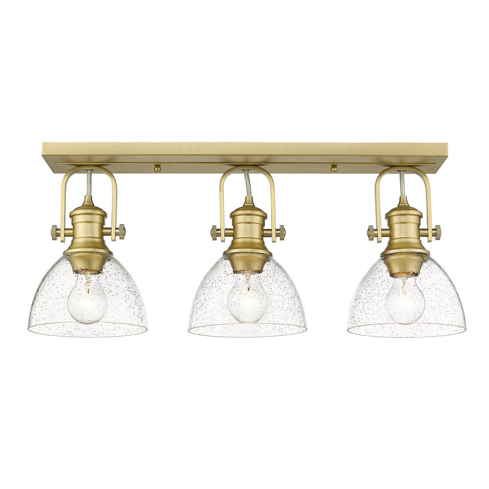 Bring modern elegance into your home with the Yep by Golden Lighting Hines 3-light Semi-Flush Mount. Featuring a Seeded Glass shade and a Brushed Champagne Brass frame, it creates a luxurious atmosphere. The Seeded Glass shade features clear glass adorned with tiny air bubbles, adding a unique, antique-inspired texture. It elegantly diffuses light, creating an inviting glow that enhances any interior decor. The Brushed Champagne Brass finish blends warmth with a modern touch, making it ideal for contemporary settings while maintaining vintage charm. Perfect for entryways, bedrooms, kitchens, or living areas with mid-height ceilings, the fixture is Damp Location Rated for installation in humid spaces. Adjustable directional heads allow for customized lighting, giving you complete control over your ambiance. Overall dimensions measure 23.13"W x 10.38"H x 6.88"D, requiring three E26 Medium base bulbs (not included) with a maximum wattage of 60 each. Experience the combination of sophistication and quality craftsmanship that will beautifully brighten your home.