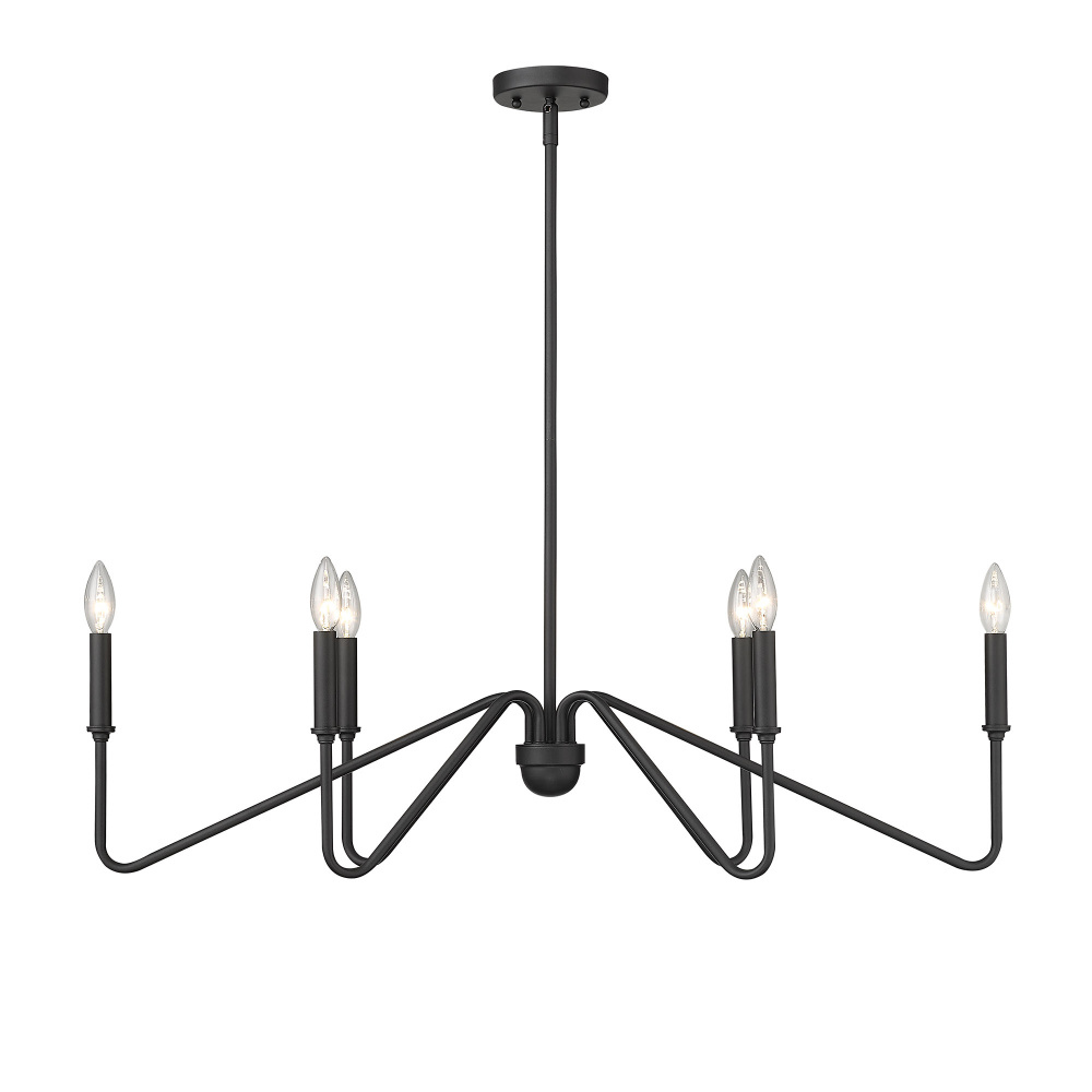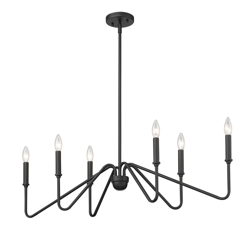 Bring a touch of industrial charm into your home with the Yep by Golden Lighting Kennedy 6-light Island Light. Featuring a sleek Natural Black finish, it creates a captivating statement without the need for a shade. Its minimalist design emphasizes clean lines and provides versatile illumination. The fine, matte texture retains a tactile, grounded appeal while illuminating your space beautifully. The Natural Black finish serves as a perfect backdrop, ensuring compatibility with various styles, from modern farmhouse to transitional. Ideal for kitchen islands, this fixture is Dry Location Rated for safe use in indoor environments away from moisture. Its adjustable height, ranging from 9.375" to 49.875", allows for easy installation, even on sloped ceilings. Overall Dimensions: 36.75"W x 9.38"H x 9.38"D. Requires 6 E12 Candelabra base bulbs (not included), max 60 watt per bulb. Elevate your space with this quality fixture designed for durability and aesthetic appeal.