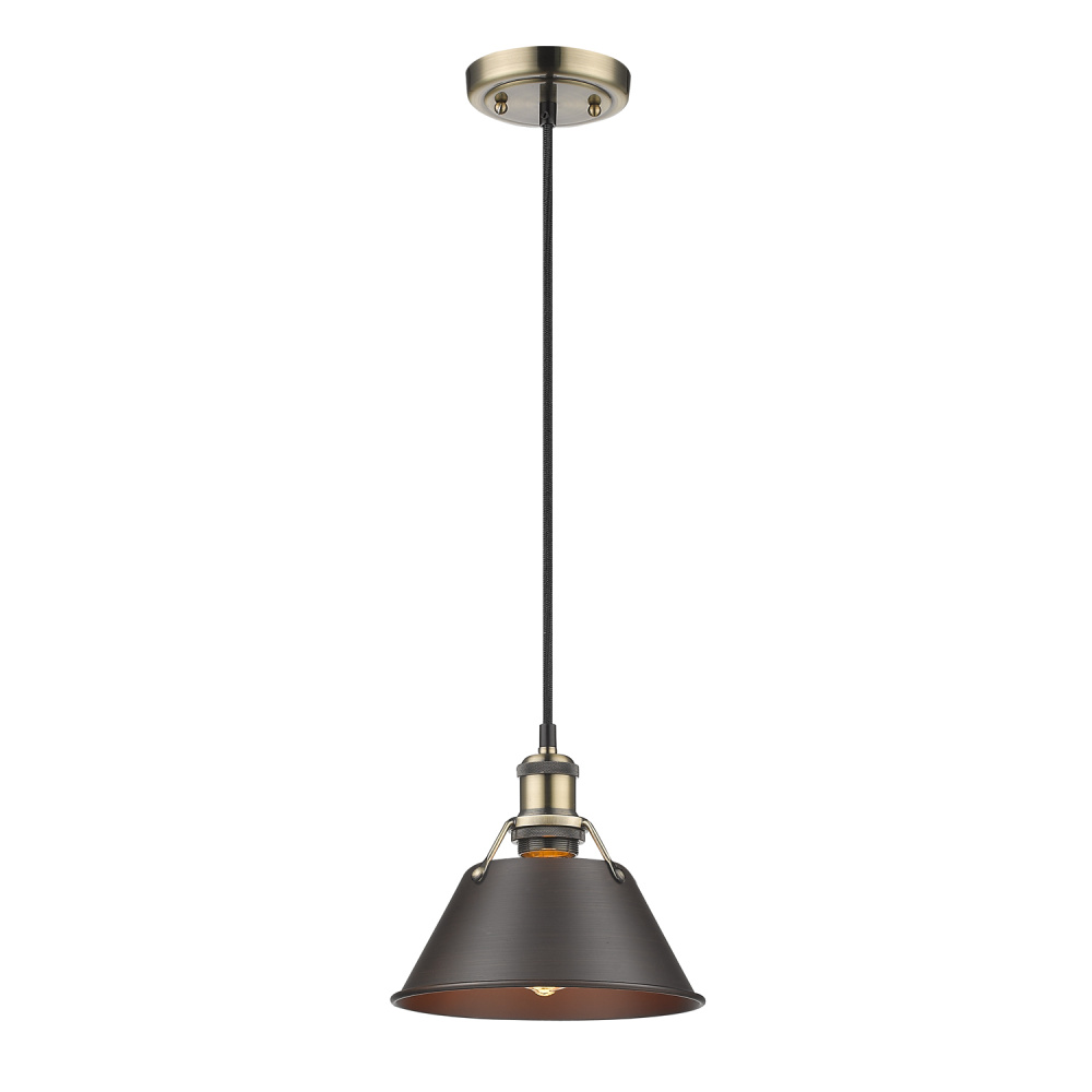 Bring industrial elegance into your home with the Yep by Golden Lighting Orwell 1-light 8in Pendant. Featuring a metal shade and an aged brass frame, it creates a welcoming atmosphere in any space. The rubbed bronze metal shade offers subtle, warm coppery highlights that diffuse light beautifully, enhancing the vintage character of your interior. Embrace timeless elegance with our Aged Brass finish – a sophisticated choice that adds depth and character to traditional or transitional styles. This fixture is damp location rated, making it suitable for covered spaces like bathrooms and porches. Installation is hassle-free with sloped-ceiling compatibility and adjustable height. Dimensions are 7.5"W x 7.5"H x 7.5"D, and it requires 1 E26 medium base bulb (not included) with a maximum wattage of 100. Elevate your home with quality craftsmanship and a touch of rustic charm.