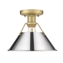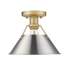 Introduce industrial elegance into your home with the Yep by Golden Lighting Orwell 1-light Flush Mount. Featuring a metal shade and an aged brass finish, it creates a welcoming atmosphere. The aged brass finish showcases a warm, antiqued gold color with darker undertones, paired with a low-luster satin sheen that beautifully diffuses light. This makes it the perfect addition for adding refined luxury and character to various spaces. It's damp location rated, making it suitable for low ceilings in areas such as hallways, bathrooms, and closets. Requires one E26 medium base bulb (not included), with a maximum wattage of 100, overall dimensions are 10"W x 8"H x 10"D, providing wide illumination in compact settings.