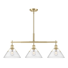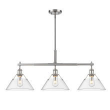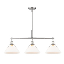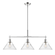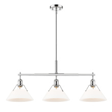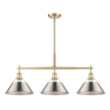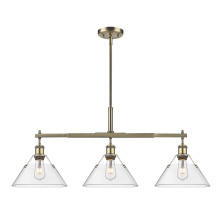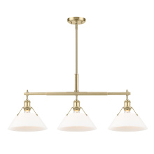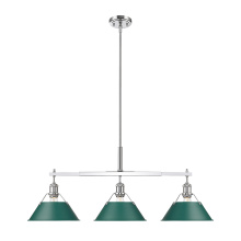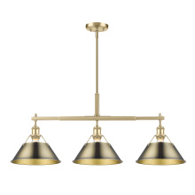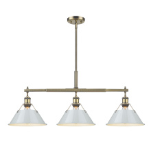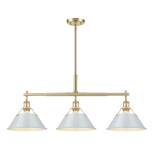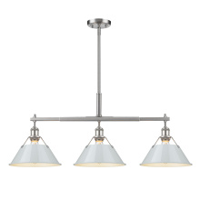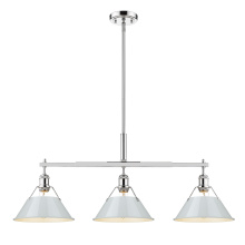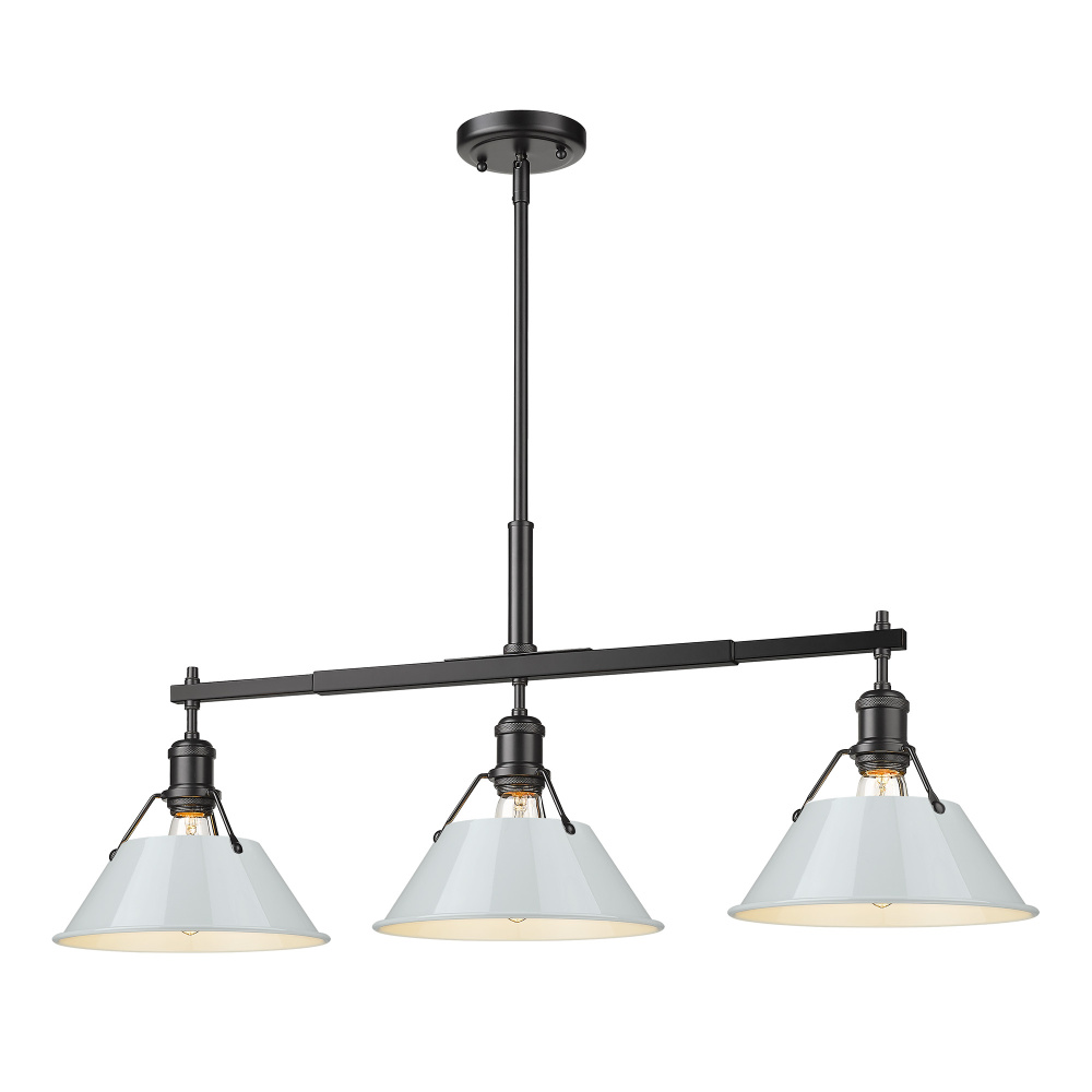 Bring industrial elegance into your home with the Yep by Golden Lighting Orwell 3-light Island Light. Featuring a dusky blue metal shade and a matte black frame, it creates a welcoming atmosphere. The dusky blue shade provides a serene and sophisticated touch, reminiscent of vintage enamelware, enhancing the fixture’s clean lines. This finish adds a calming accent to your kitchen space while being practical. The matte black finish is timeless and endlessly versatile, offering understated elegance that complements various decor styles. Tailored for kitchen islands, this fixture is dry location rated, making it ideal for indoor spaces. It's sloped-ceiling compatible and adjustable in height from 17.125" to 59.125", ensuring it fits perfectly in your space. Overall dimensions are 35.75"W x 14.5"H x 10"D, and it requires 3 E26 medium base bulbs (not included) with a maximum wattage of 100 per bulb. Elevate your kitchen decor with this stunning lighting option that harmonizes style and function.
