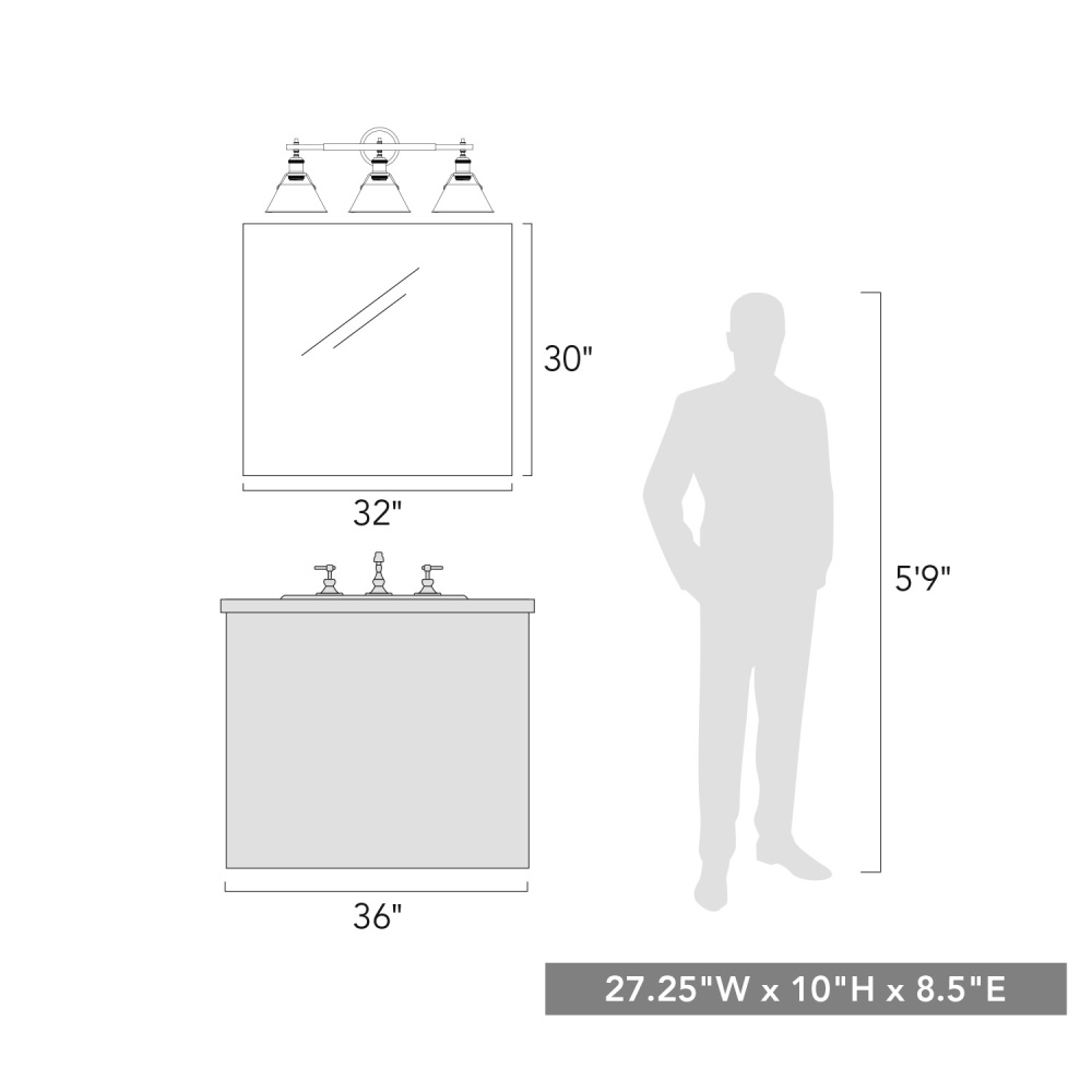 Bring industrial elegance into your home with the Yep by Golden Lighting Orwell 3-light Vanity. Featuring a rubbed bronze shade and a polished Chrome frame, it creates a warm and inviting atmosphere. The metal shade in rubbed bronze is a timeless choice that adds depth and warmth with subtle highlights of coppery bronze while providing soft, diffused light. The brilliant and timeless Polished Chrome finish offers a crisp, clean look that elevates any space, integrating seamlessly into a variety of decor styles. This finish is created using a durable electroplating process, making it easy to keep clean while adding polished perfection. Ideal for brightening up bathrooms with dedicated lighting that flatters, the vanity light is damp location rated, suitable for covered and semi-enclosed spaces. It requires 3 E26 Medium base bulbs (not included), with a maximum wattage of 100 per bulb, and has overall dimensions of 27.25"W x 9.88"H x 8.5"D. Enhance the functionality of your space while embracing style and quality with this stunning fixture.