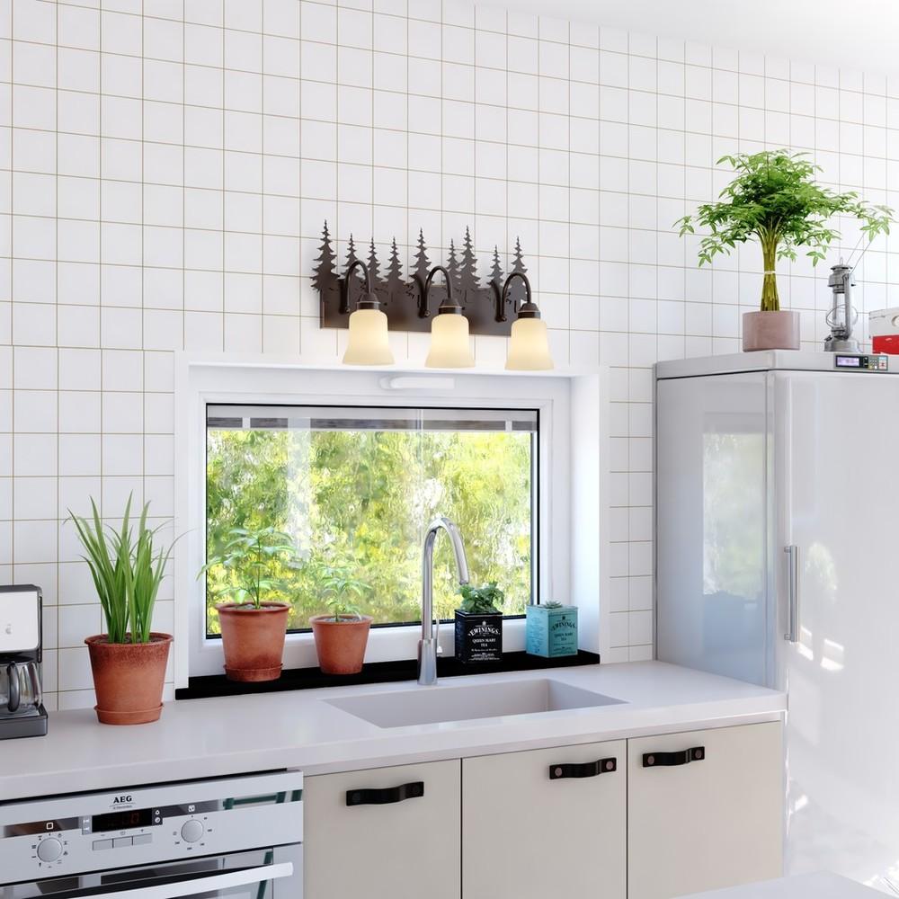 Evoking the spirit of the wilderness, this rustic themed light is clad in a burnished bronze finish and features silhouetted tree imagery atop glowing amber flake glass. It is a great choice for a vacation lodge, cabin or suburban home and will complement a variety of home styles: anywhere you want to bring an element of nature. This bathroom light is perfect over medium vanities or as a pair over double sinks.