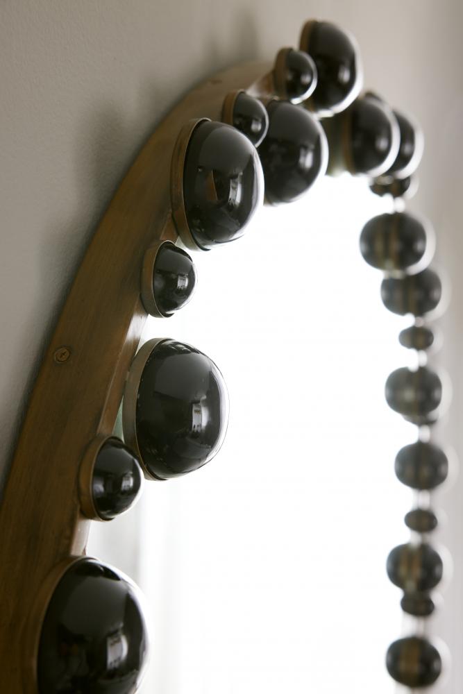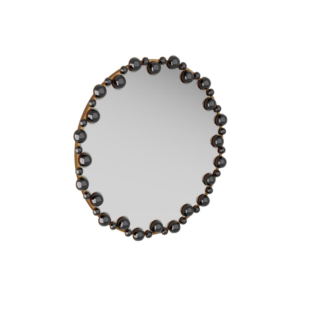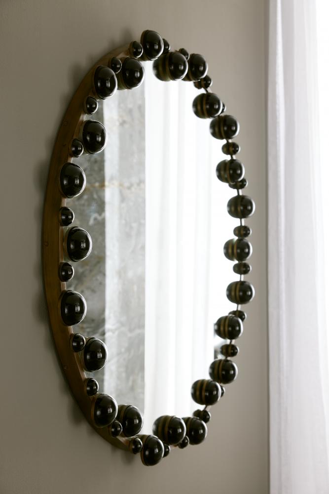 A playful mix of sophisticated materials and organic forms. Inspired by a jewelry setting, a roundel of black glass is encircled with effervescent dome-shaped spheres of varying sizes. Encased in an antique brass iron, it is fitted with a cleat for secure hanging. Finish will vary. Vertical only.
