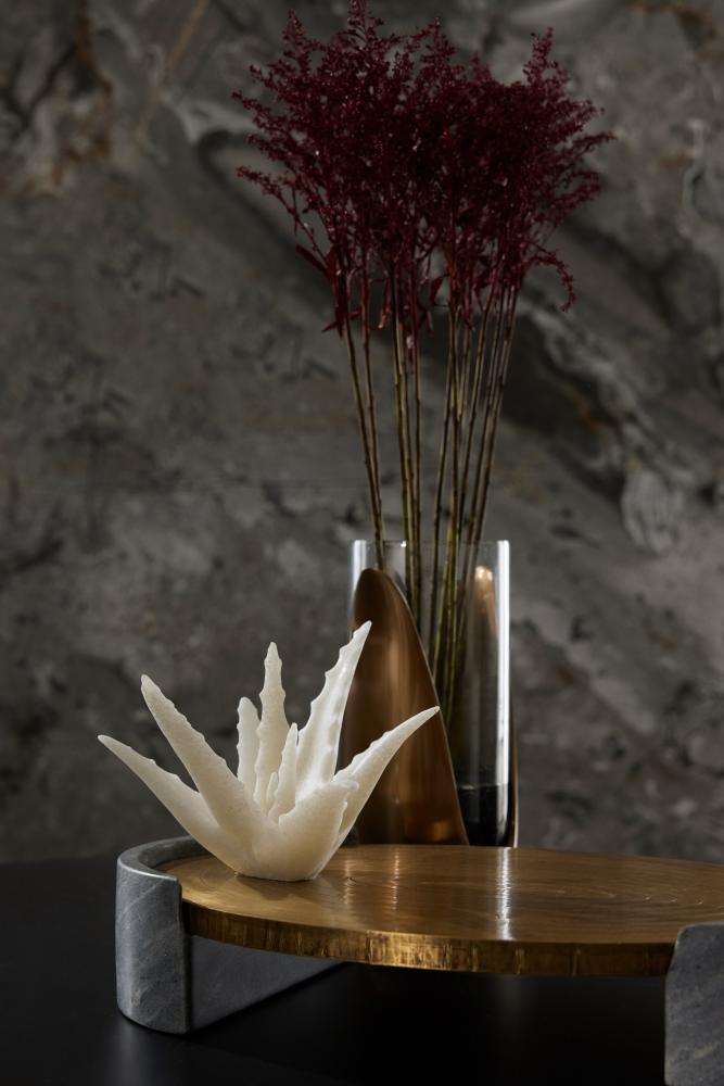 The natural textures of an aloe vera plant inform a chic sculpture of ivory ricestone composite. Inspired by the landscape design of Palm Springs, its elegant form is both organic and modernist. Finish will vary.
