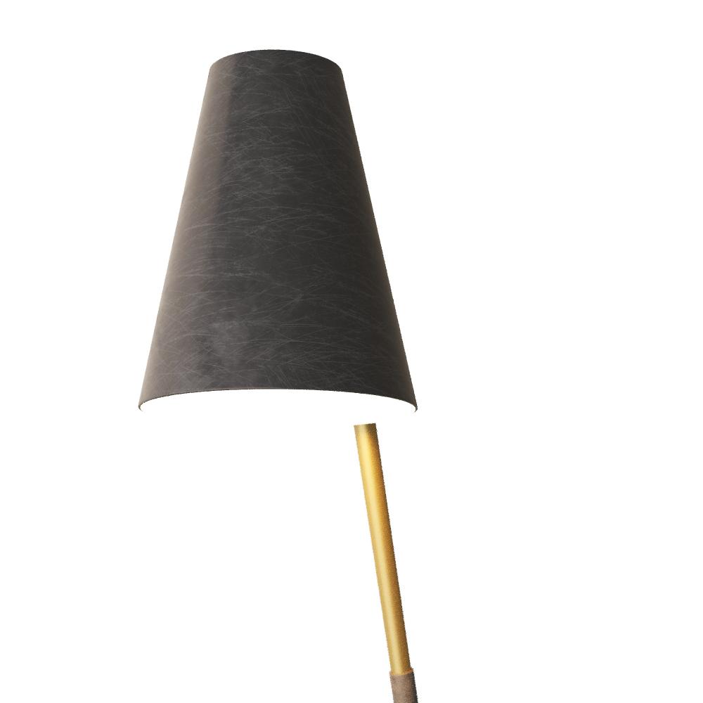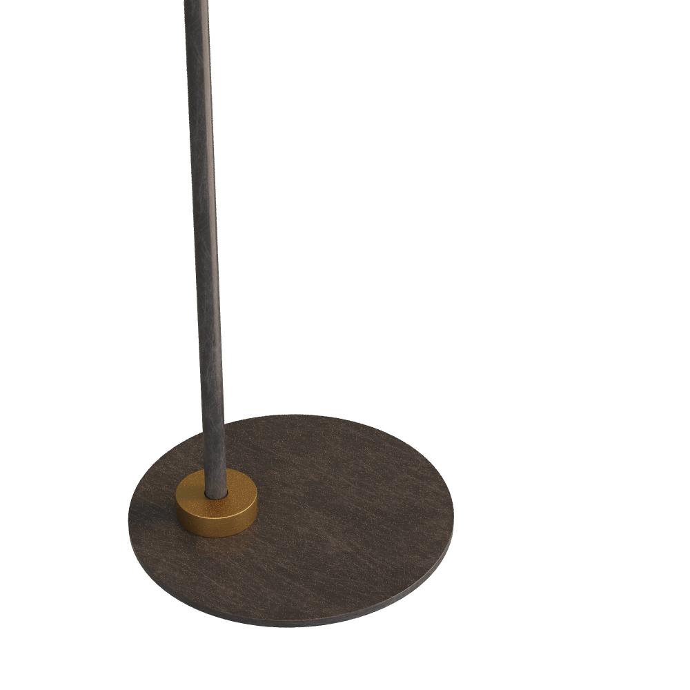 This masculine style offers a modern mix of materials and finishes. A slender vertical rod in English bronze and antique brass finish supports a conical shade of bronze. Mounted on a matching circular base with antique brass accents, it is finished with a taupe cloth cord. Full-range dimmer.