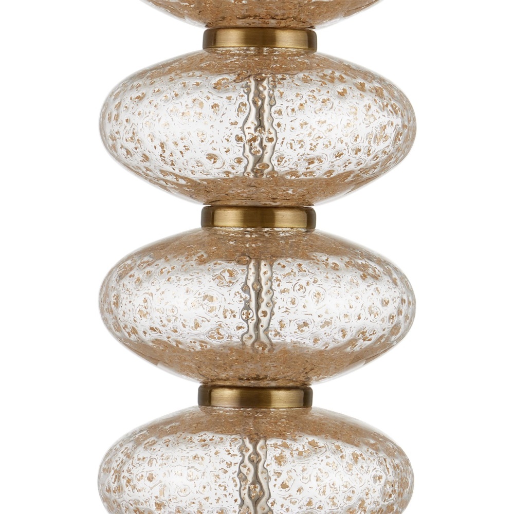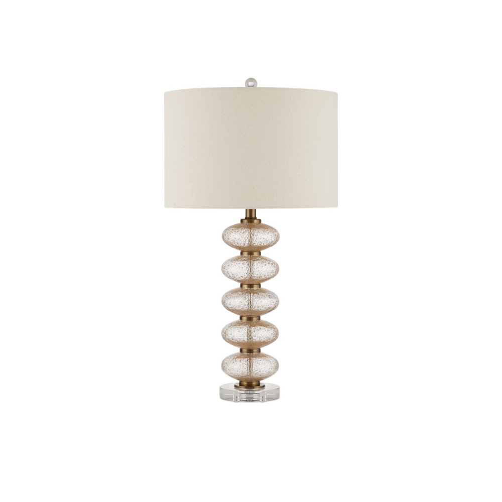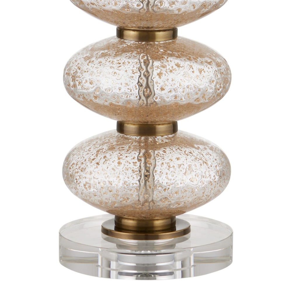 With its beautifully realized stippled glass globes that have been pressed into oblong shapes, the Zebulon Table Lamp is an artisanal wonder. The antique brass metal rings that sit between the glass elements draw out the gold speckles in the glass, and the optic crystal base and finial echo the freshness of the clear glass orbs. Because the blown glass has so much personality, this clear lamp will be a glamorous decorative element in a room.