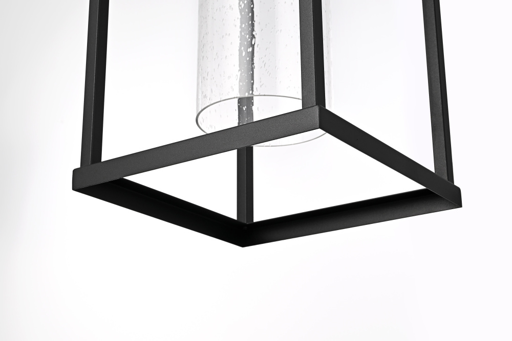 This outdoor wall light blends architectural structure with functional lighting, featuring a geometric open-frame design and a peaked top that gives it a bold, defined look. The clear seedy glass cylinder at the center allows the light to shine through while adding subtle texture and depth. Crafted from iron and aluminum, the durable black-finished frame ensures long-term performance in outdoor conditions and is ETL Wet Rated for reliability in entryways, patios, and garage exteriors. Available in 14-inch, 19-inch, and 24-inch heights, this fixture offers versatility to complement different outdoor spaces. The dimmable function allows for adjustable brightness when paired with a compatible dimmer, while the E26 medium-base socket (bulb not included) provides flexibility for different bulb styles. Pre-wired with a 7-inch lead, this wall light is a strong and stylish choice for enhancing outdoor spaces. Built with marine-grade, corrosion-resistant aluminum, this sconce withstands coastal conditions for long-lasting durability.