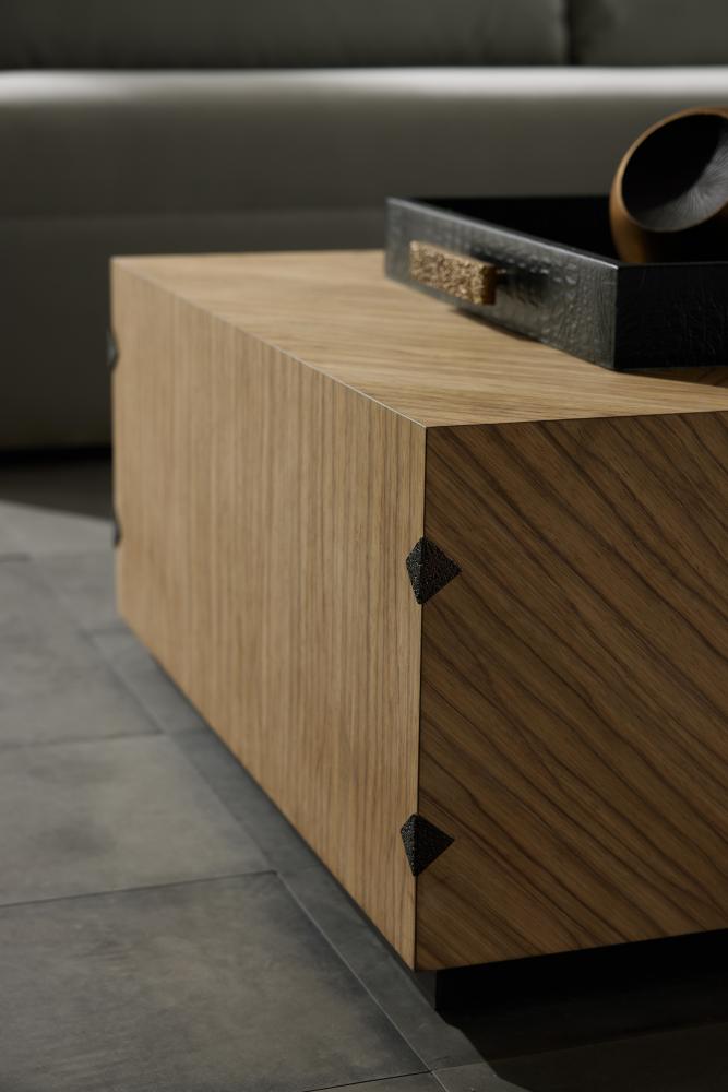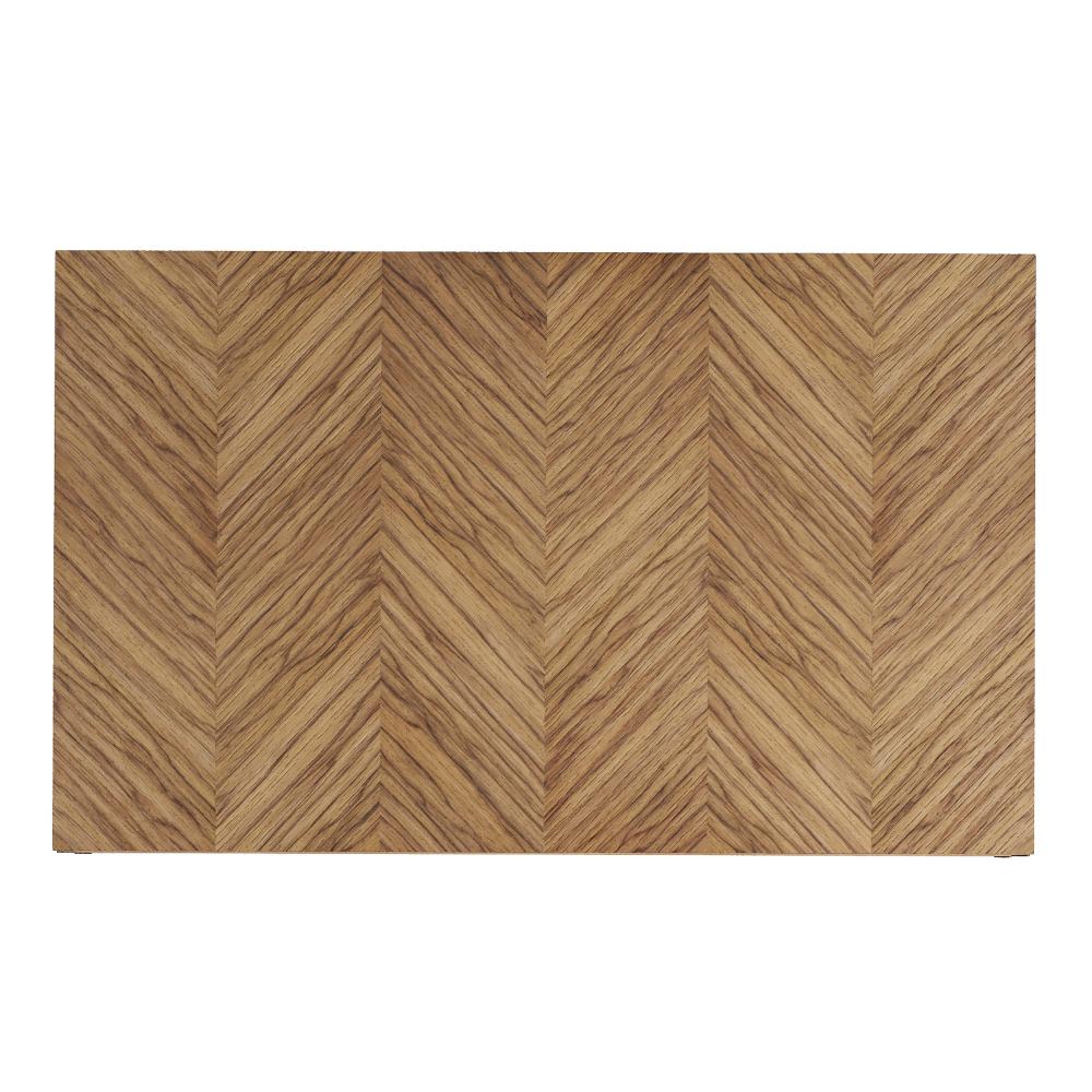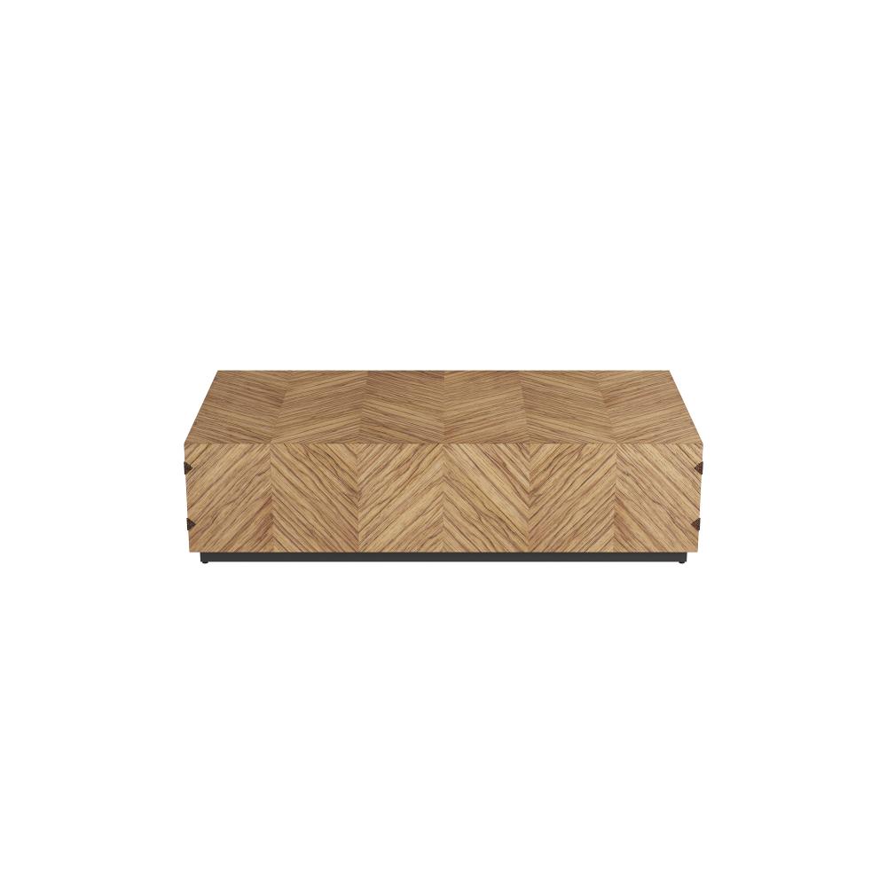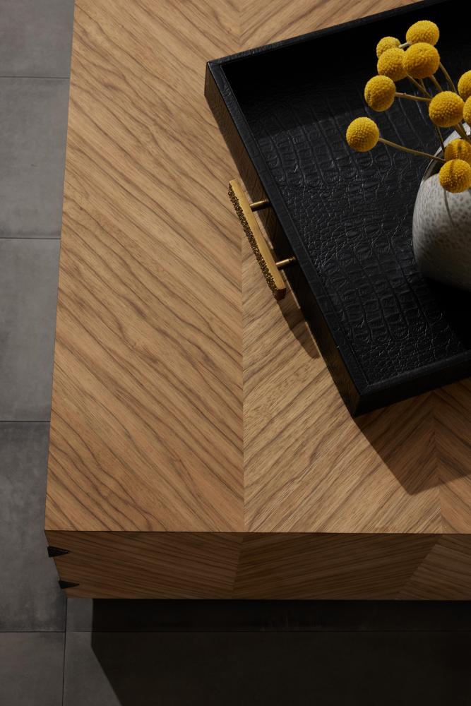 A chevron pattern of mixed Ofram veneer with an oyster finish lends masculine appeal to the Zuki. Hardware details make all the difference for this seemingly simplistic cocktail table. Its geometric appeal is enhanced with bronze accents at each vertical edge. Finish will vary.